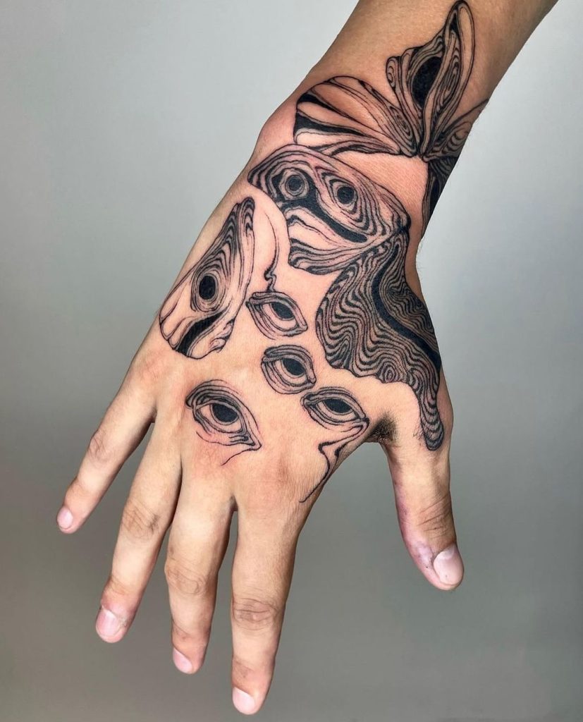 This unique tattoo design flows across the hand with abstract eyes embedded in swirling, wavy patterns that resemble wood grain or cosmic lines. The eyes peek out from different sections, giving the artwork an eerie yet intriguing feel. The surreal placement and organic shapes make it look like a blend of nature and fantasy.