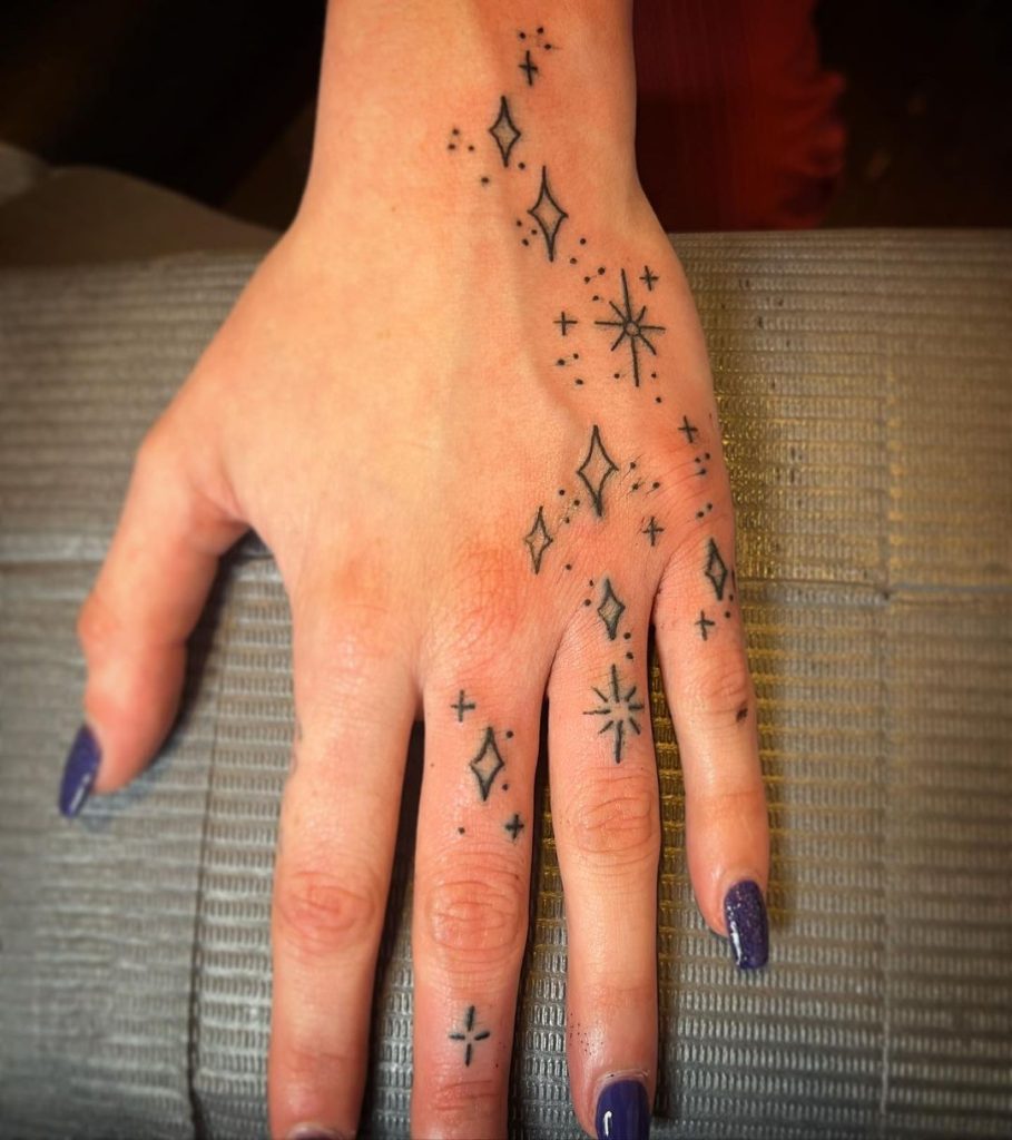 This tattoo features a charming scatter of stars, diamond shapes, and tiny dots flowing across the hand and fingers. The varied shapes and placements create a whimsical, cosmic vibe, making it look like a sprinkle of stardust. Perfect for someone who loves minimalist designs with a touch of celestial magic.
