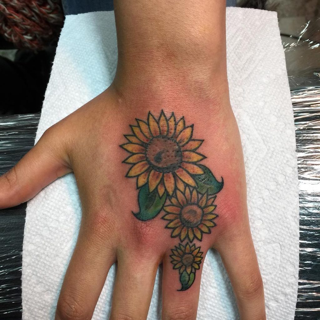 This tattoo showcases a trio of cheerful sunflowers in bright yellow and green, positioned on the back of the hand and extending onto a finger. The bold colors and layered petals give the flowers a lively, uplifting look, symbolizing warmth and positivity. Perfect for someone who loves nature and wants a joyful floral design.