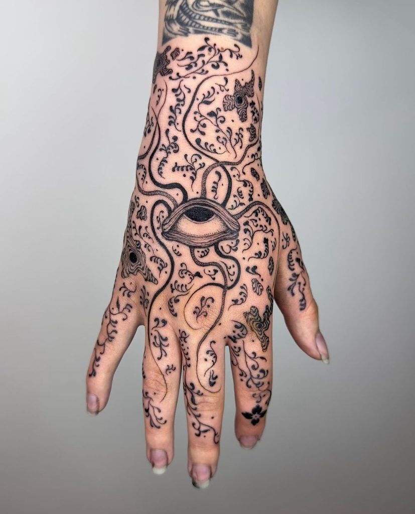 This detailed tattoo features a central eye surrounded by swirling vines and floral patterns that spread across the hand and fingers. The intricate linework and ornamental design give it a mystical, protective quality, with the eye appearing as a watchful symbol. It s a striking, decorative piece perfect for those who love symbolic art.