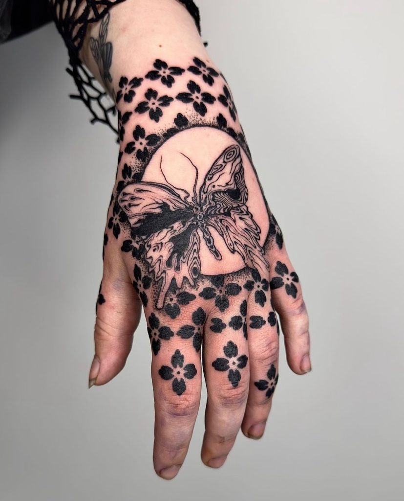 This hand tattoo showcases a striking butterfly with intricate linework at the center, set against a background of bold black flowers that spread across the hand and fingers. The combination of the delicate butterfly and the dark blossoms creates a beautiful contrast, making it feel like nature and night meet in one unique design.