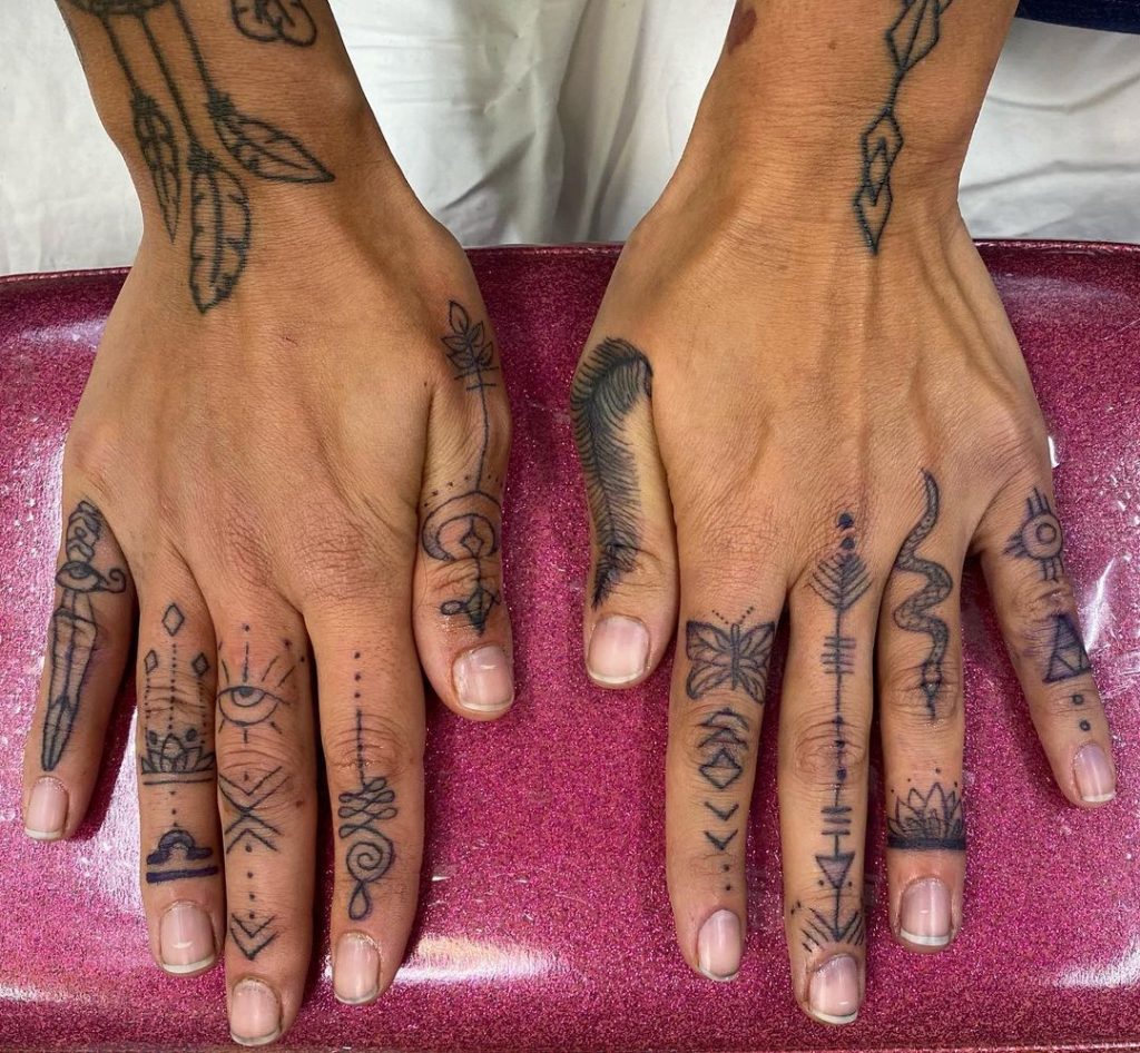 These hands display a variety of small, unique symbols tattooed across the fingers and knuckles, including arrows, eyes, feathers, and mystical shapes. Each design is simple yet meaningful, giving the hands a spiritual, bohemian vibe. Perfect for someone who enjoys collecting symbols that tell a personal story.