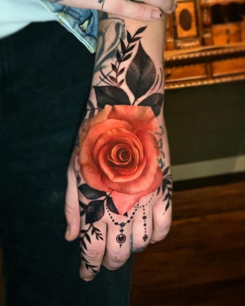 This stunning tattoo showcases a vibrant, lifelike orange rose that blooms on the back of the hand, surrounded by dark leaves for contrast. Delicate beaded chains with small charms drape over the fingers, adding an elegant, jewelry-inspired touch to the design. Perfect for someone who loves bold, colorful florals with a sophisticated twist.