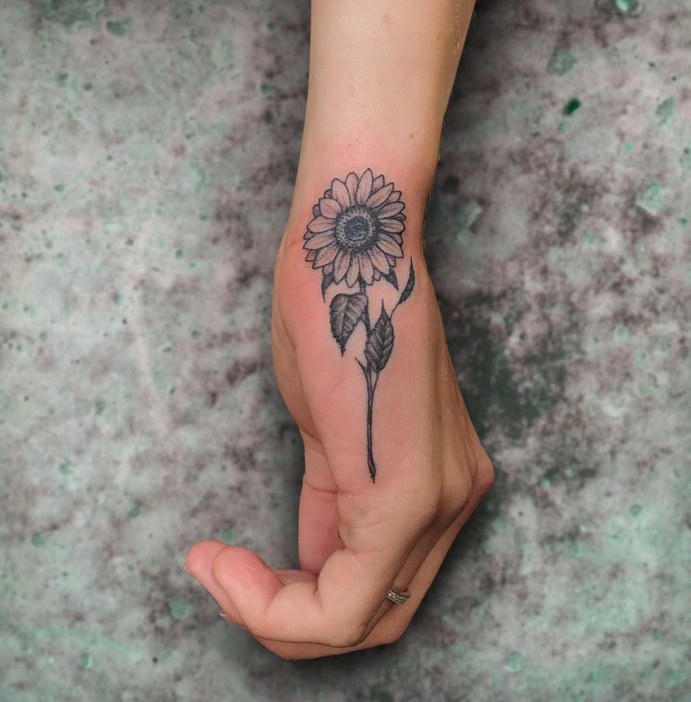 This tattoo showcases a delicate sunflower with detailed petals and leaves, positioned beautifully on the side of the wrist. The clean lines and soft shading bring the sunflower to life, symbolizing warmth and positivity. Perfect for someone who wants a small, meaningful floral piece.