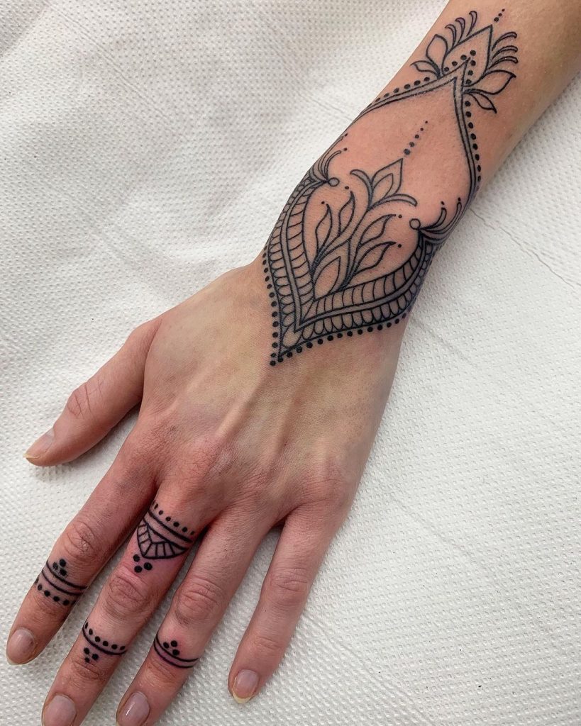 19. Elegant Henna-Inspired Tattoo on Hand and Fingers