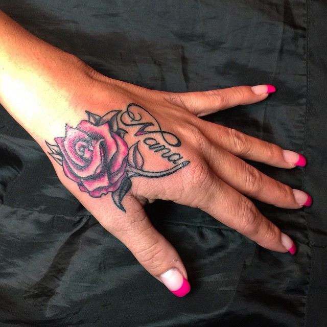 22. Rose Tribute Tattoo with ‘Nana’ Script on Hand