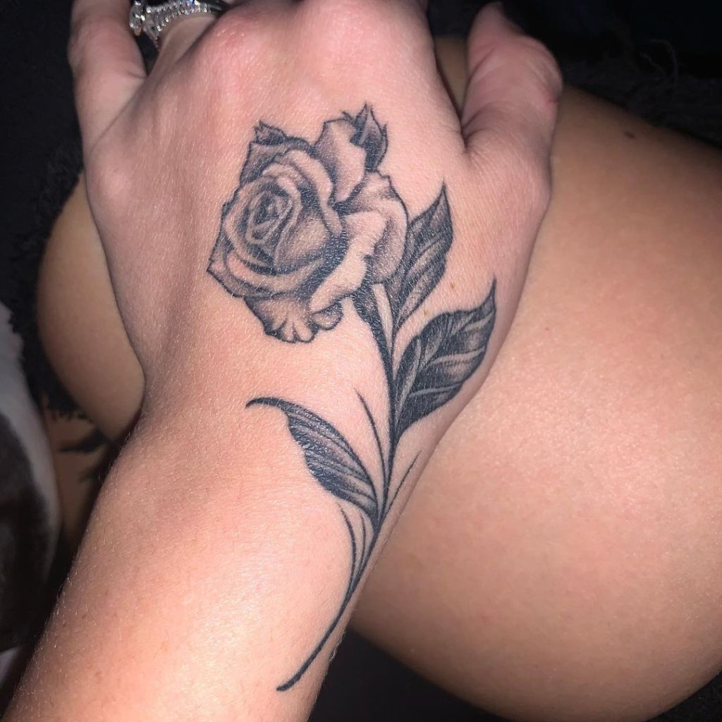 This tattoo features a detailed rose in full bloom, with softly shaded petals and bold leaves along the stem that wraps gracefully over the hand. Its classic design and dark shading give it a timeless beauty, perfect for someone who loves the elegance and romance of a rose.