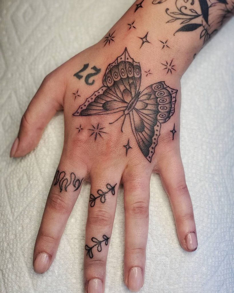 This tattoo showcases a detailed butterfly in mid-flight on the hand, surrounded by small stars that add a touch of magic. Delicate vine and line designs on the fingers complete the look, making it feel like a charming, nature-inspired scene. Ideal for someone who loves a playful and free-spirited style.
