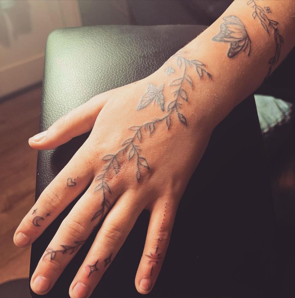 This tattoo features a soft, flowing vine that stretches across the hand, accented by tiny butterflies and subtle details on the fingers, like stars, moons, and hearts. The fine lines and gentle shading create a whimsical, nature-inspired look, perfect for someone who loves delicate, dreamy designs.