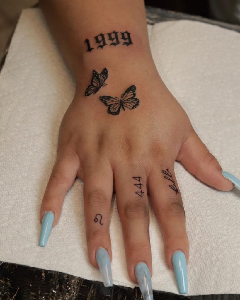 This tattoo combines the year “1999” in bold lettering with two delicate butterflies on the back of the hand, adding a touch of elegance and nostalgia. Simple symbols and numbers like “444” and a zodiac sign are placed on the fingers, creating a personal, meaningful collection. It s perfect for someone who values significant dates and symbols in a stylish, minimalistic way.