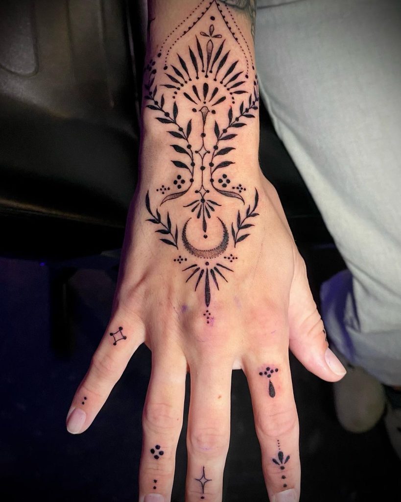This tattoo features a graceful, henna-inspired design that flows from the wrist onto the hand, with delicate leaves, dots, and symmetrical shapes creating a mesmerizing pattern. The fingers are adorned with matching dots and lines, adding a cohesive and decorative touch. It s perfect for someone who loves a refined and timeless look reminiscent of traditional henna art.