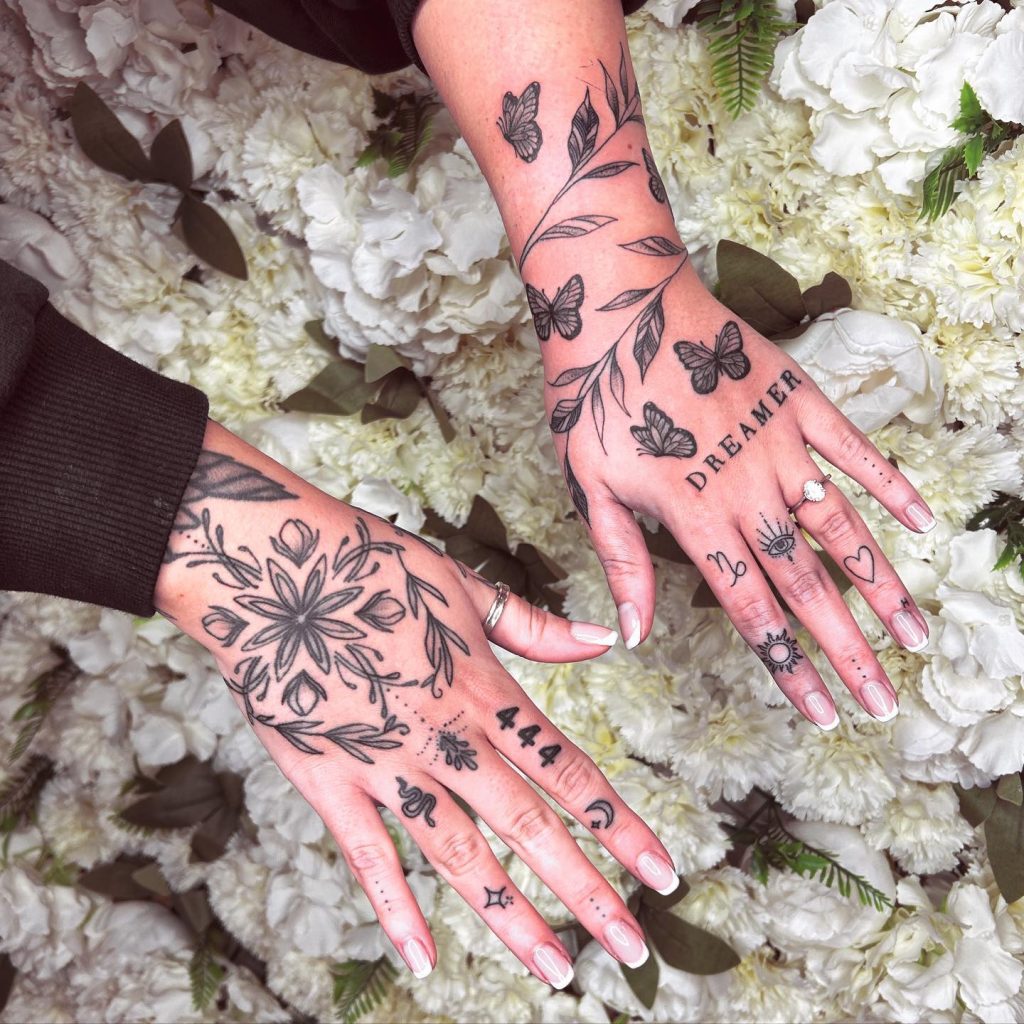 These hands are decorated with a mix of floral patterns, butterflies, and meaningful symbols. One hand features a large mandala-style flower, while the other showcases delicate vines and butterflies alongside the word “Dreamer.” Tiny symbols like stars, hearts, and astrological signs add personality to each finger, creating a whimsical and artistic look perfect for someone with a free spirit and creative soul.