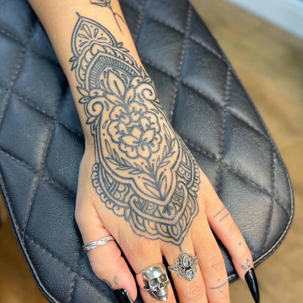 This tattoo showcases an intricate mandala pattern with floral elements, covering the back of the hand and extending slightly onto the wrist. The delicate lines and detailed symmetry give it a lace-like, ornamental look, adding a touch of elegance and tradition. Perfect for someone who appreciates beautifully detailed and timeless designs.