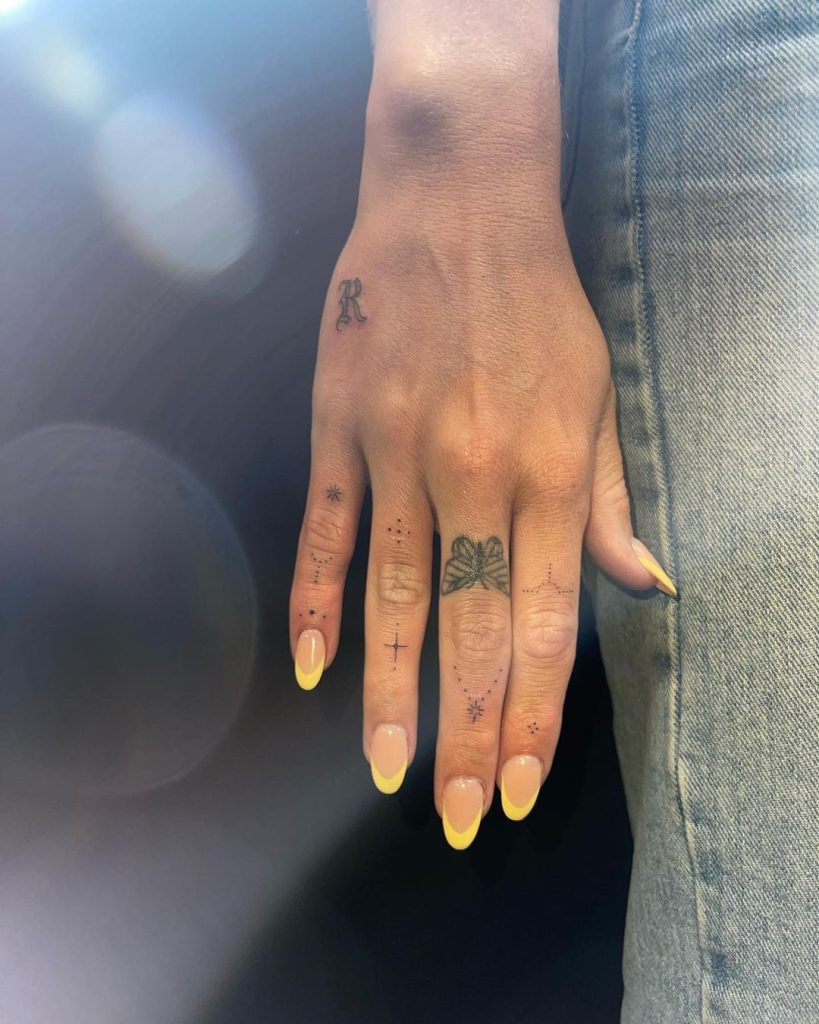 This tattoo features a small, elegant “R” on the hand, along with tiny stars, dots, and crosses scattered delicately across the fingers. A charming bow design on one finger adds a sweet touch, giving the whole look a whimsical, celestial vibe. It s perfect for someone who enjoys subtle, meaningful details that add a touch of personality.