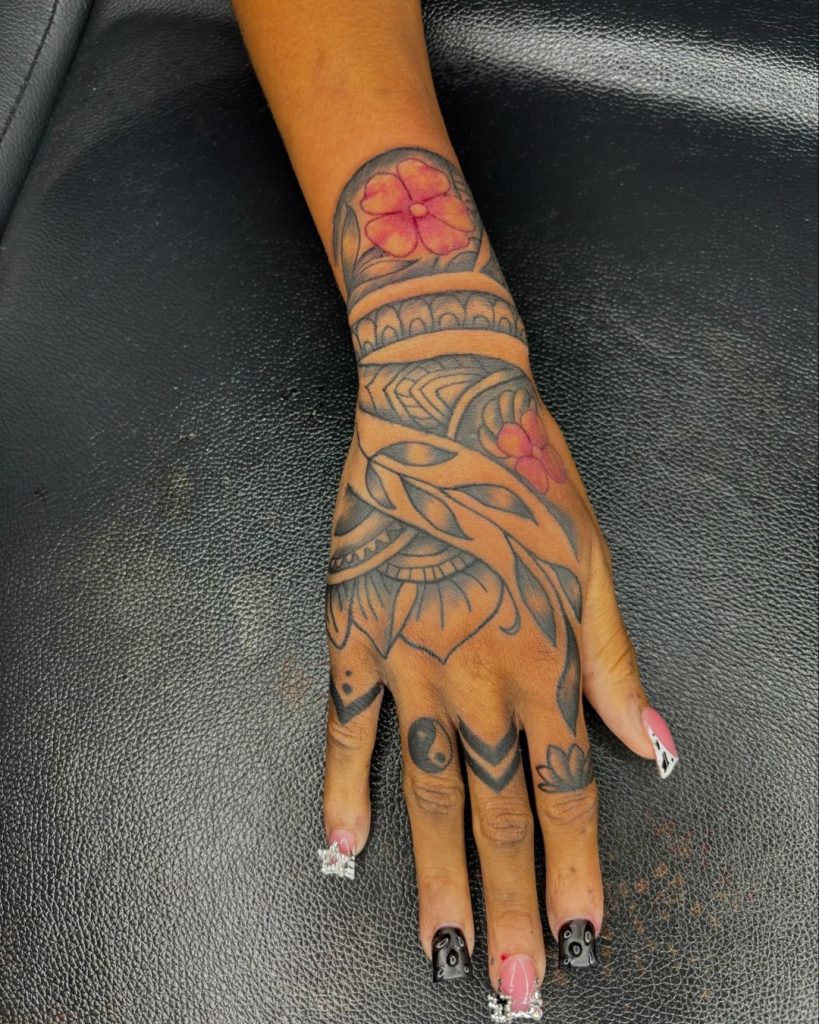 This tattoo features an eye-catching design with intricate mandala patterns, leafy accents, and pink flowers across the hand and wrist. The mix of bold black lines and soft pink hues adds contrast and depth, while small symbols like a yin-yang bring extra meaning. Perfect for someone who loves striking, artistic designs with a touch of nature and balance.