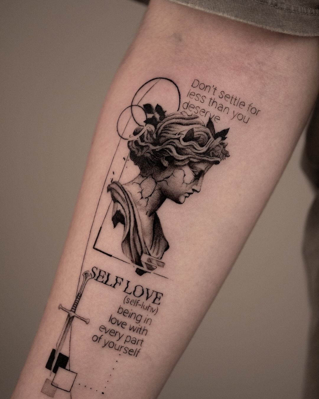 This tattoo beautifully blends classic art with a powerful message about self-acceptance. Featuring a striking depiction of a sculpture alongside inspiring words, it encourages wearers to embrace every aspect of themselves. Choosing a design that speaks to personal values can make a tattoo even more meaningful.