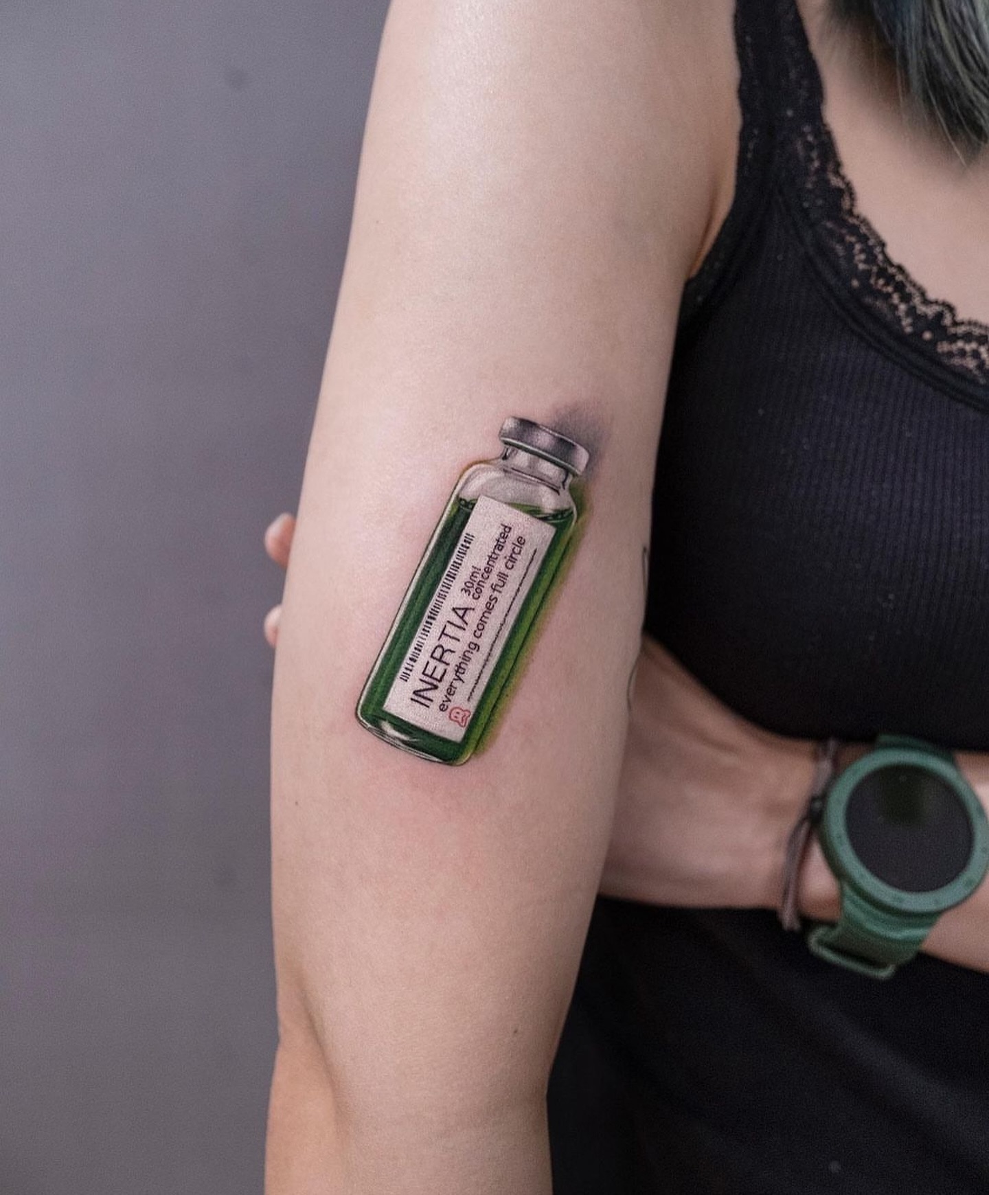 This tattoo features an impressively realistic bottle, making it a standout piece on the wearer s arm. The intricate details and lifelike colors create a sense of depth, drawing the viewer’s eye. For those exploring unique tattoos ideas, this design is a great reminder that everyday objects can be transformed into stunning art.