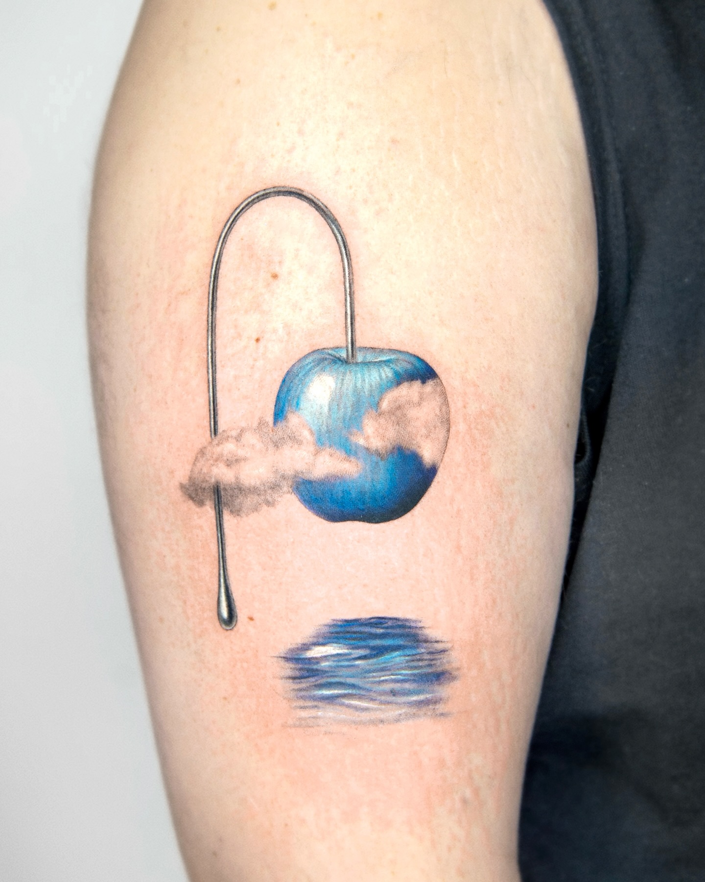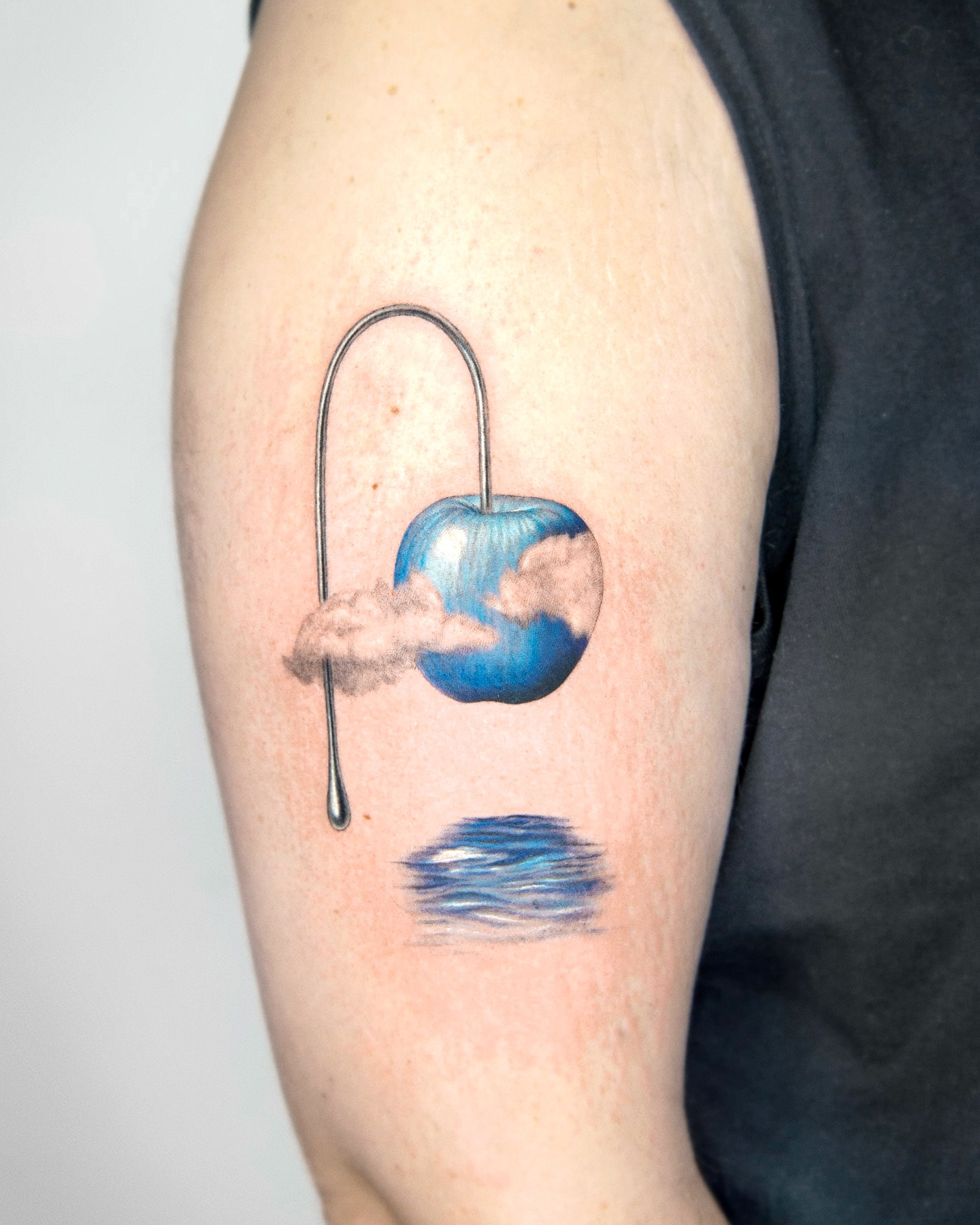 This tattoo beautifully blends the elements of sky and sea, showcasing a striking blue apple suspended by a delicate hook. The clouds add a whimsical touch, while the gentle waves below create a serene atmosphere. For those seeking unique tattoos ideas, this design inspires creativity and encourages thinking outside the box.