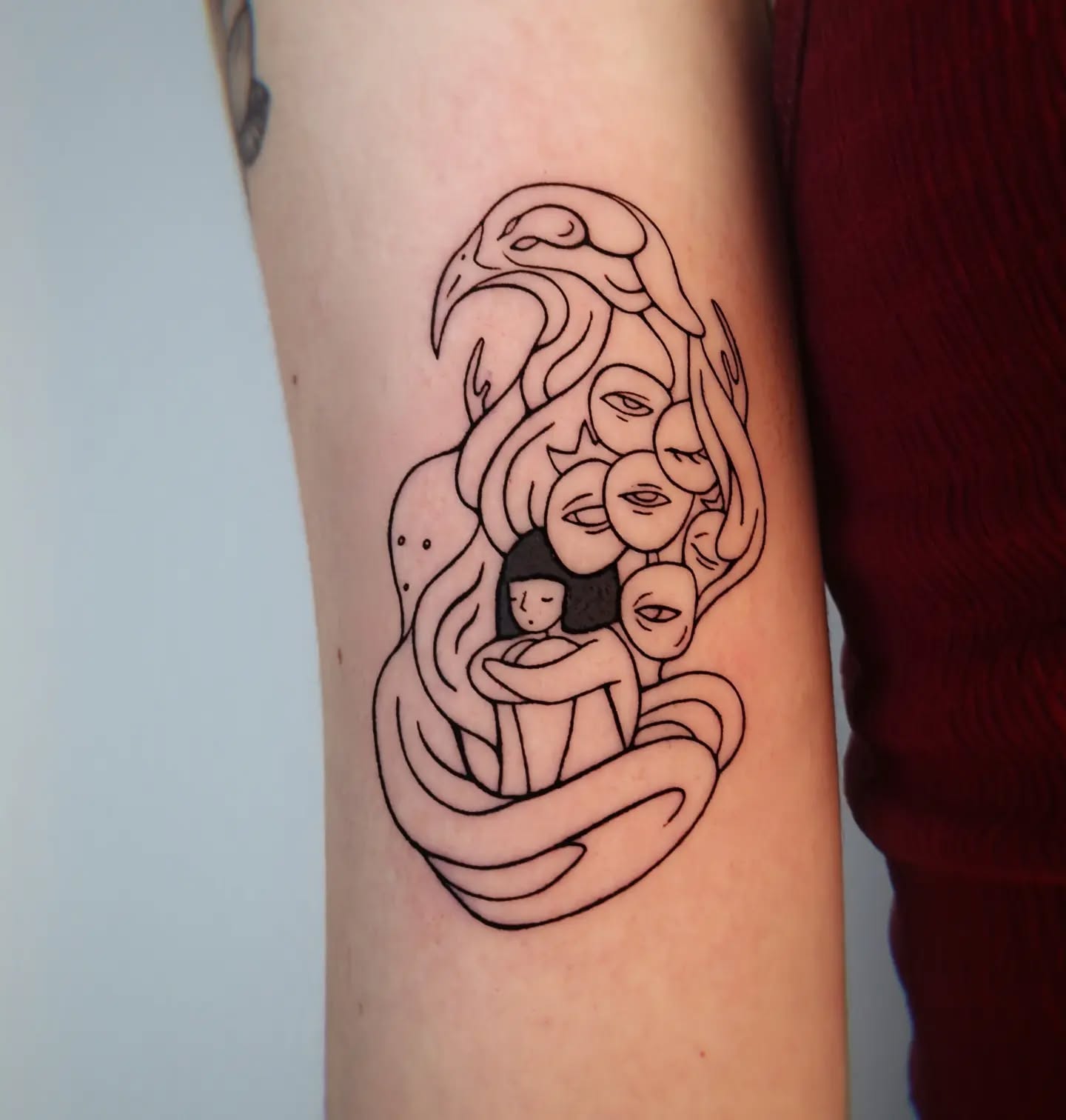 This tattoo features a beautifully intricate design that blends elements of nature and human emotion, creating a story on skin. The swirling shapes and faces evoke a sense of mystery and introspection, making it a stunning choice for anyone wanting to express their inner thoughts. When considering unique tattoos, looking for designs that resonate personally can create a meaningful connection to the art.