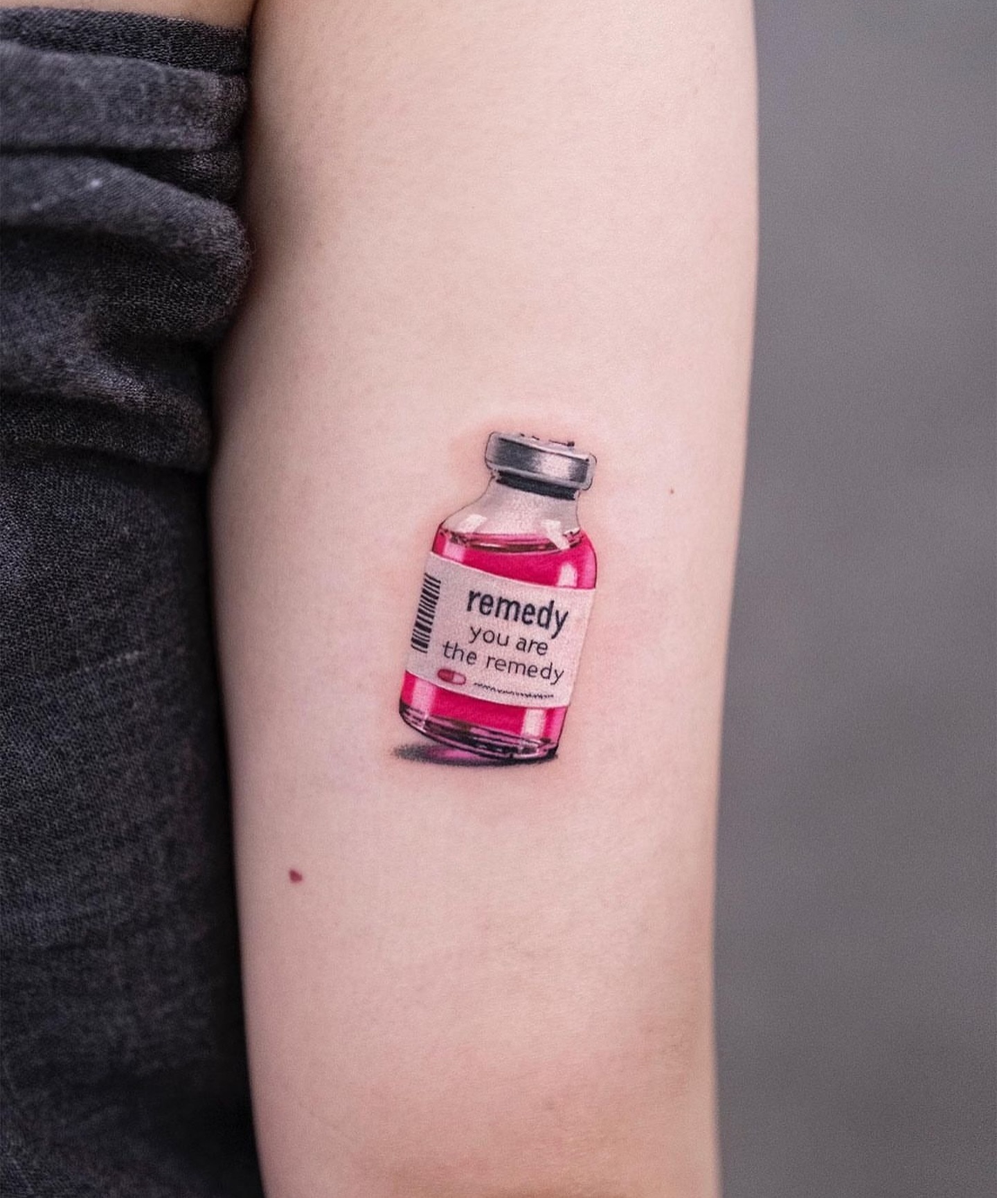 This tattoo features a beautifully designed bottle labeled “remedy,” which carries a powerful message. The vibrant colors and detailed artwork make it stand out, reminding the wearer of their ability to heal themselves and others. For those looking for unique tattoo ideas, a design like this can serve as a personal mantra or a piece of art that tells a meaningful story.