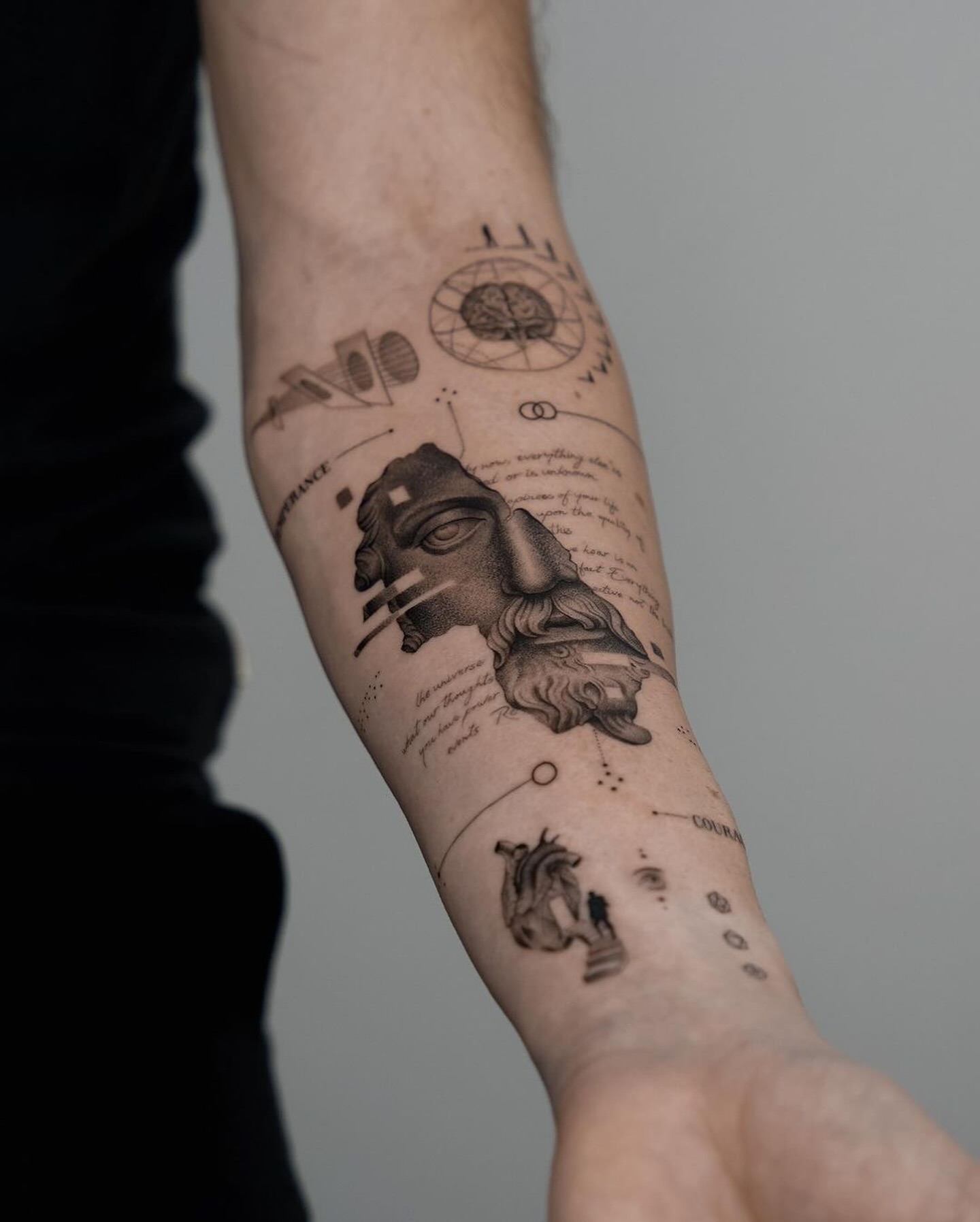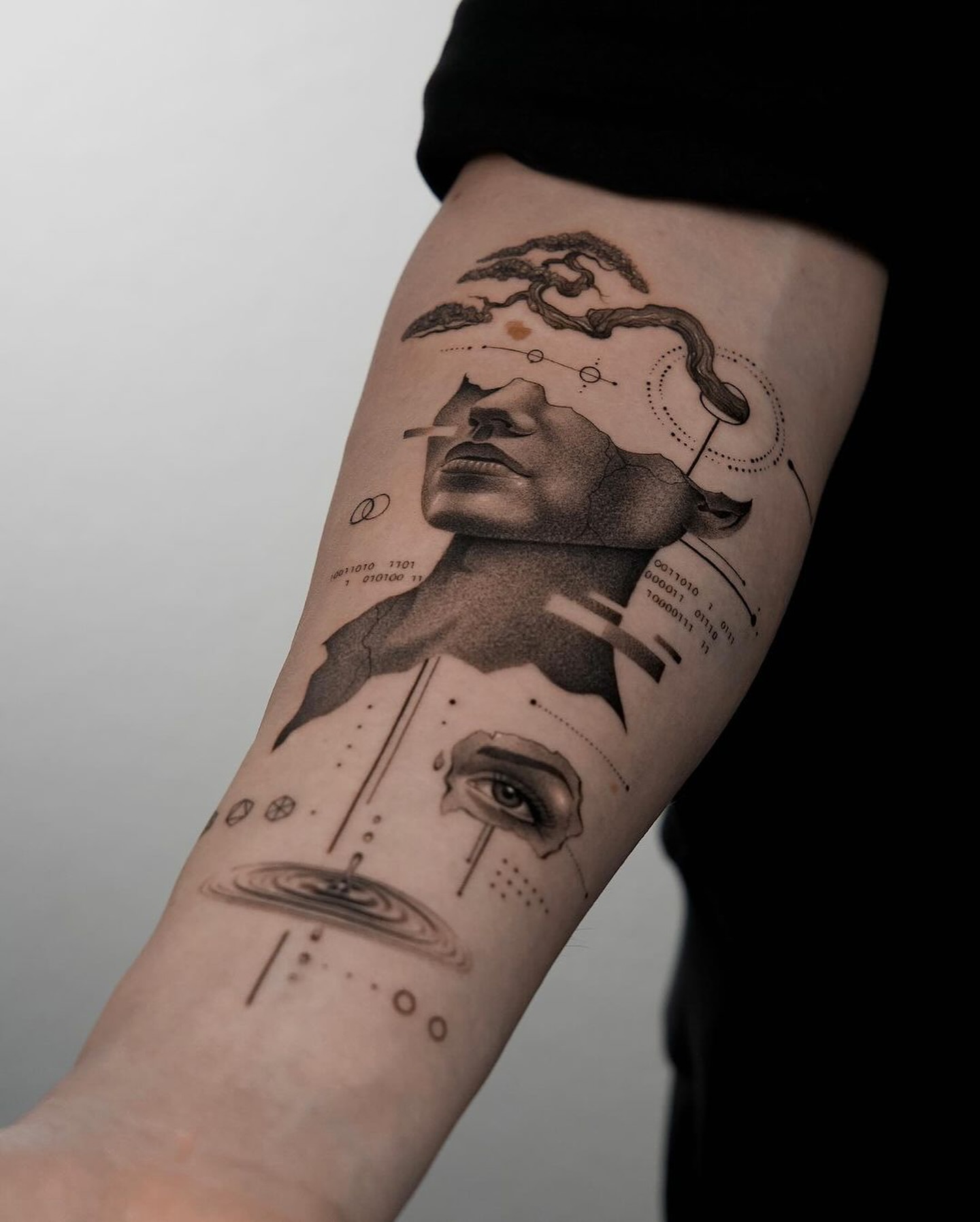 This tattoo stands out with its imaginative blend of a human face and abstract elements, creating a thought-provoking visual. The intricate details, like the eye and swirling patterns, suggest a journey into the mind, making it an excellent conversation starter. For those considering unique tattoos ideas, this design inspires creativity and personal expression, reminding people that art can reflect their inner thoughts.