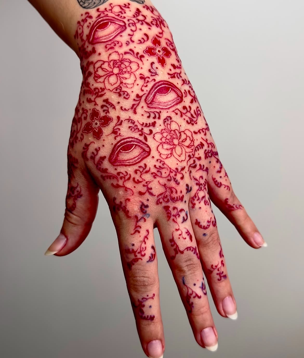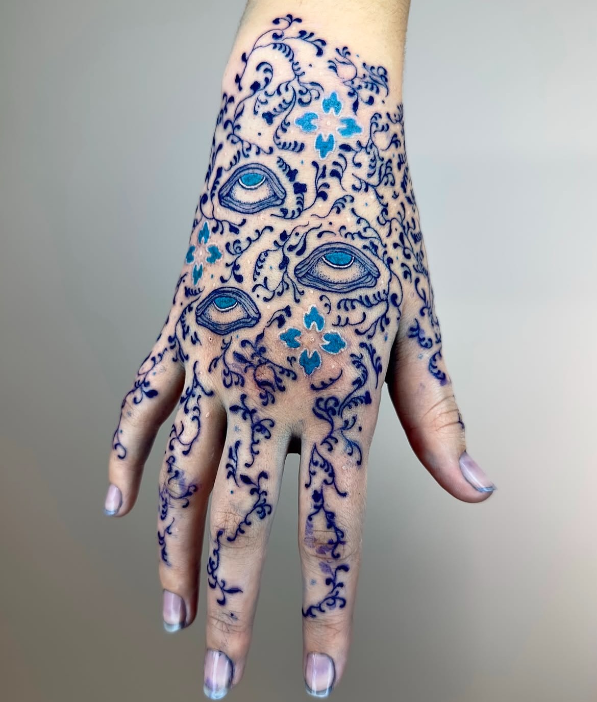 This stunning hand tattoo features intricate designs with blue eyes peering out from a beautiful floral pattern. The combination of delicate lines and vibrant colors creates a mesmerizing effect that draws attention. For those looking to express individuality, eye-themed tattoos can symbolize vision and awareness, making them a meaningful choice.