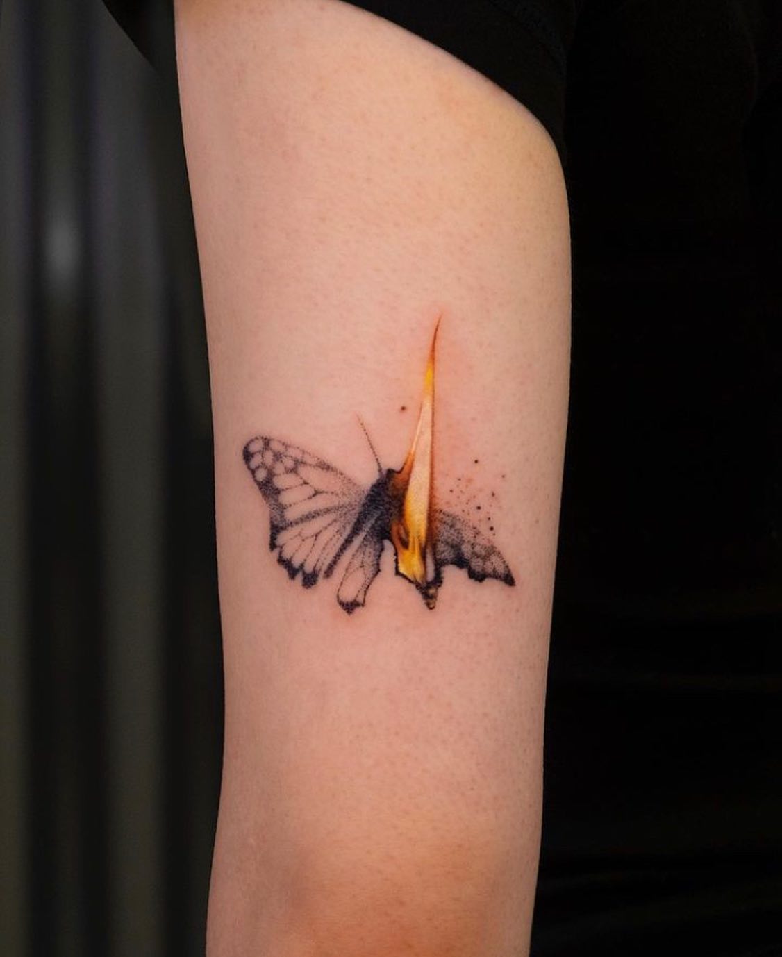 This tattoo beautifully combines the delicate image of a butterfly with a striking flame, creating a stunning visual effect. The contrast between the soft wings and the fiery detail tells a unique story of transformation and passion. For those considering a unique tattoo idea, blending different elements like nature and fire can lead to a remarkable design that reflects personal experiences.