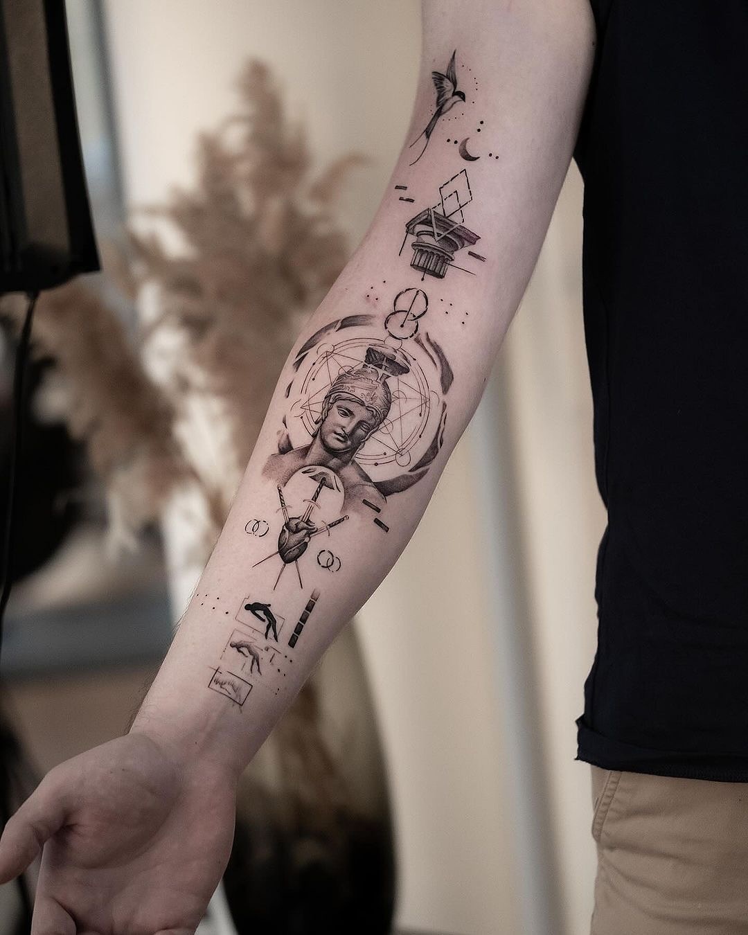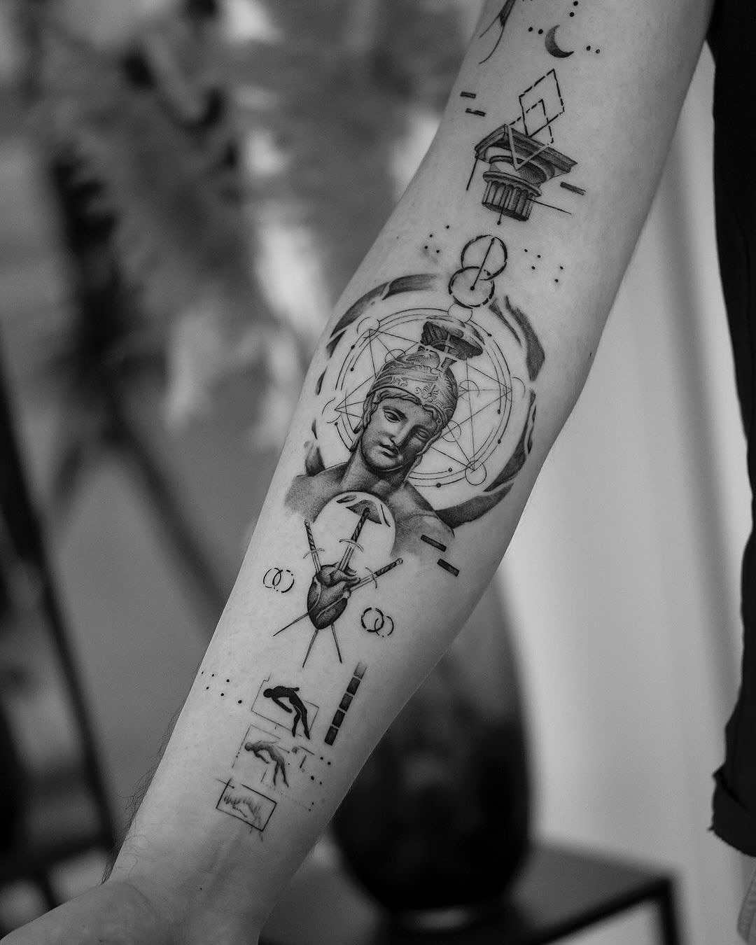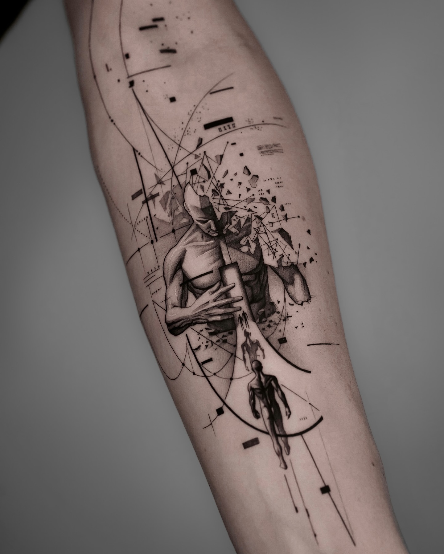 This tattoo stands out with its striking depiction of a figure in motion, surrounded by geometric shapes and lines. The design creatively illustrates the journey of human evolution, blending art and meaning in a way that sparks curiosity. When thinking about unique tattoo ideas, consider how your design can tell a personal story or reflect an important aspect of your life.