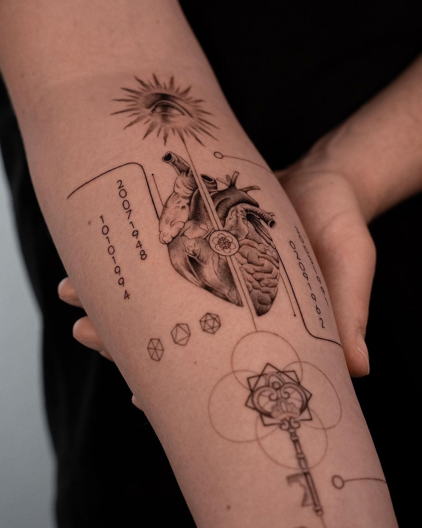 This tattoo stands out with its striking blend of a detailed heart and a mystical eye, creating a powerful visual story. The combination of organic and geometric shapes adds depth, making it a conversation starter. For those considering a tattoo, think about meaningful symbols that reflect your journey, just like this one does.