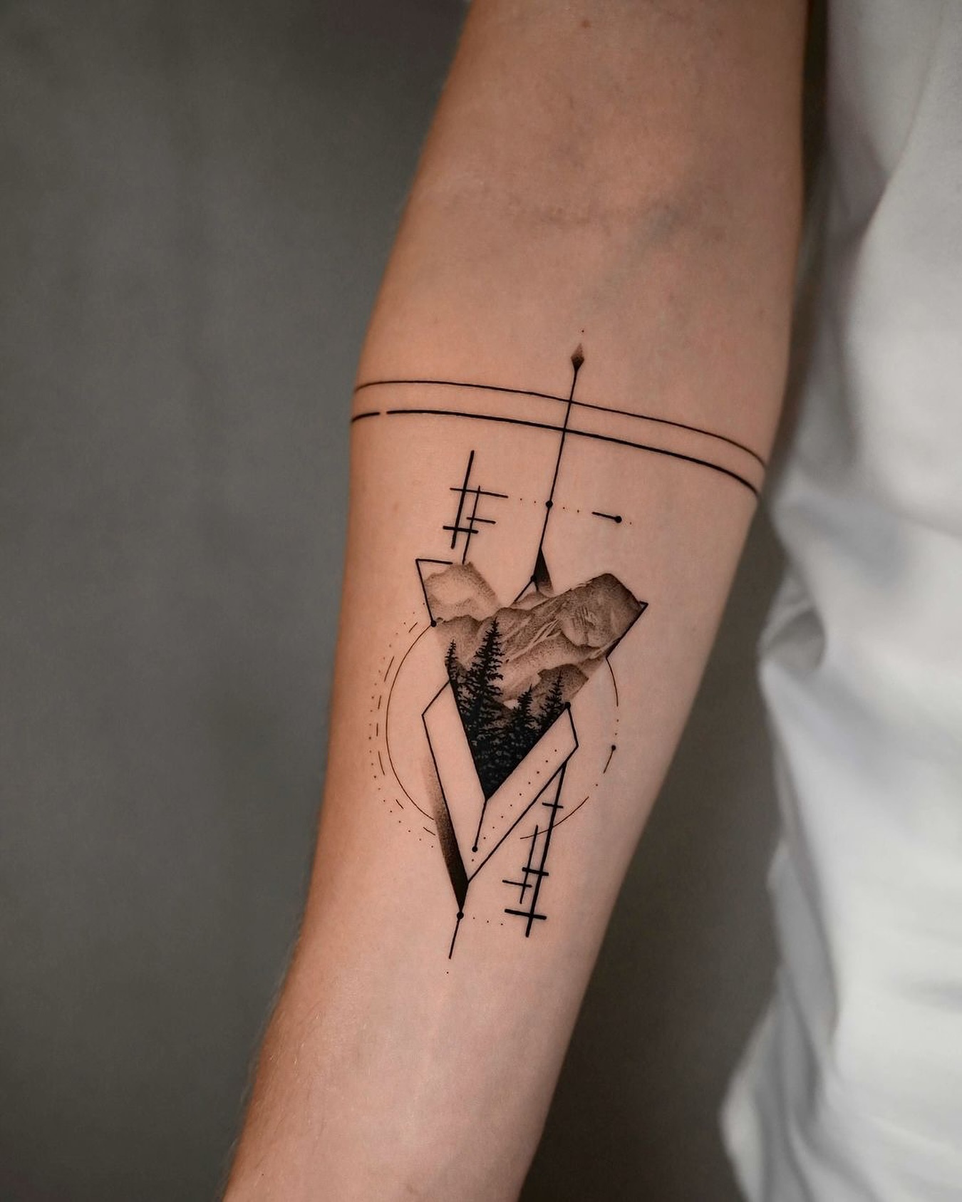 This tattoo stands out with its blend of sharp geometric shapes and a stunning natural scene within. Featuring mountains and trees, it captures the beauty of the outdoors while maintaining a modern edge. For those looking for unique tattoos ideas, this design reminds us that combining different styles can create something truly special.
