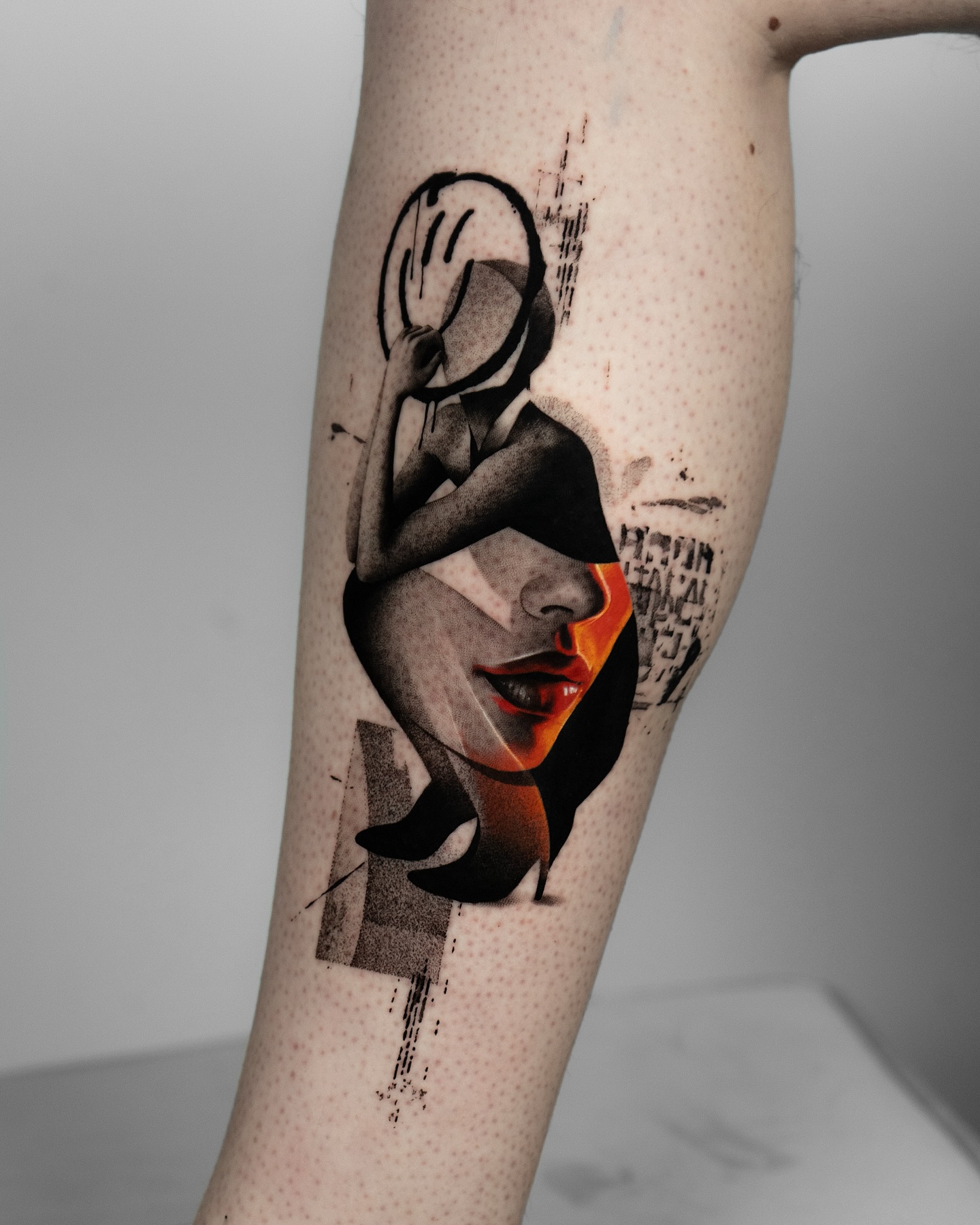 This tattoo showcases a stunning blend of shapes and colors that create a unique portrayal of a figure with an interesting twist. The use of contrasting elements, like the playful smiley face and the elegant woman’s silhouette, invites viewers to interpret the artwork in their own way. For those seeking inspiration, combining different styles can lead to a truly original tattoo that reflects personal experiences and emotions.