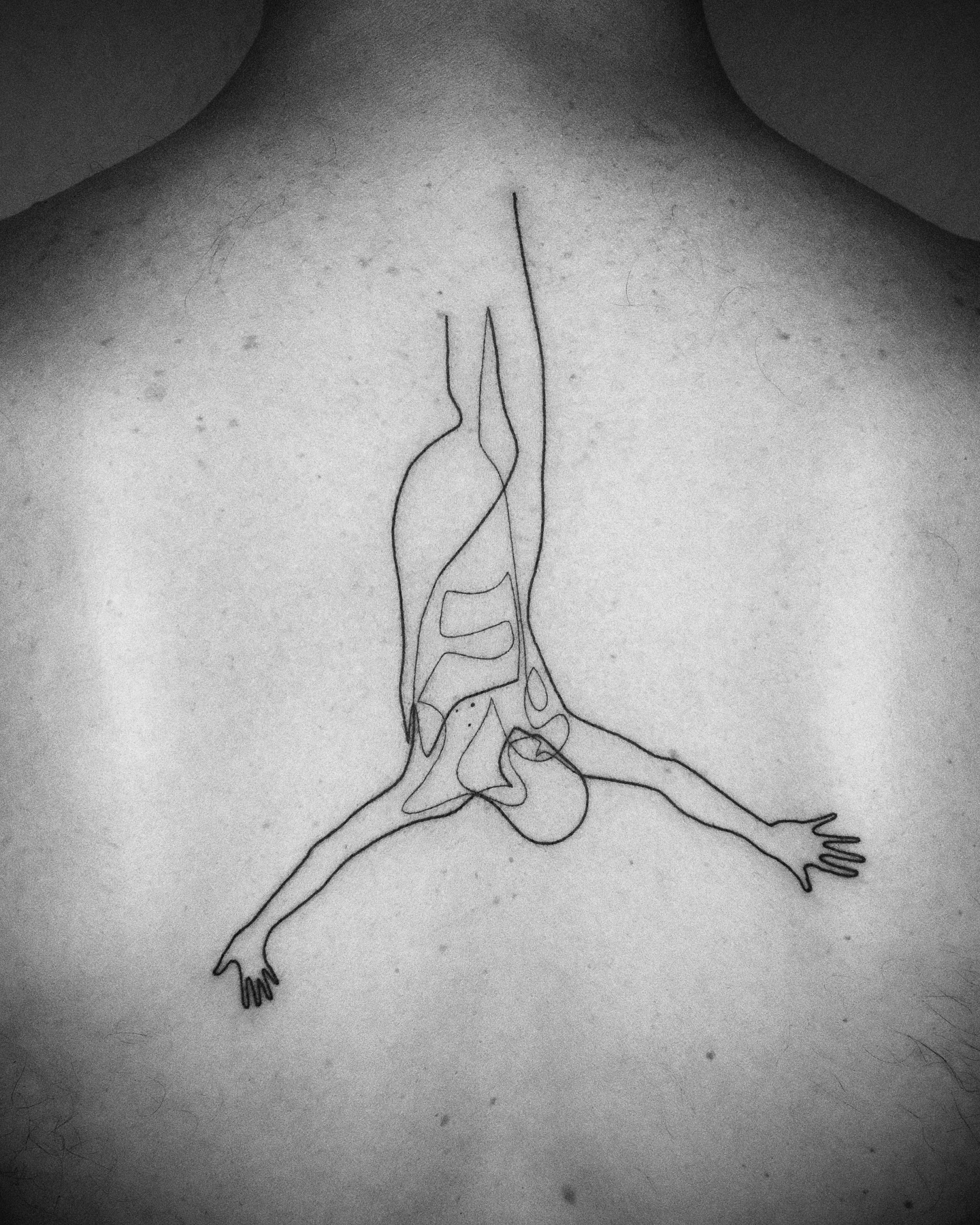 This tattoo features a striking line drawing of a diver in mid-air, capturing a moment of freedom and grace. The minimalist design makes it stand out while inviting viewers to imagine the thrill of diving into the unknown. For those seeking unique tattoos ideas, consider how a simple yet powerful image can convey deep emotions and personal stories.