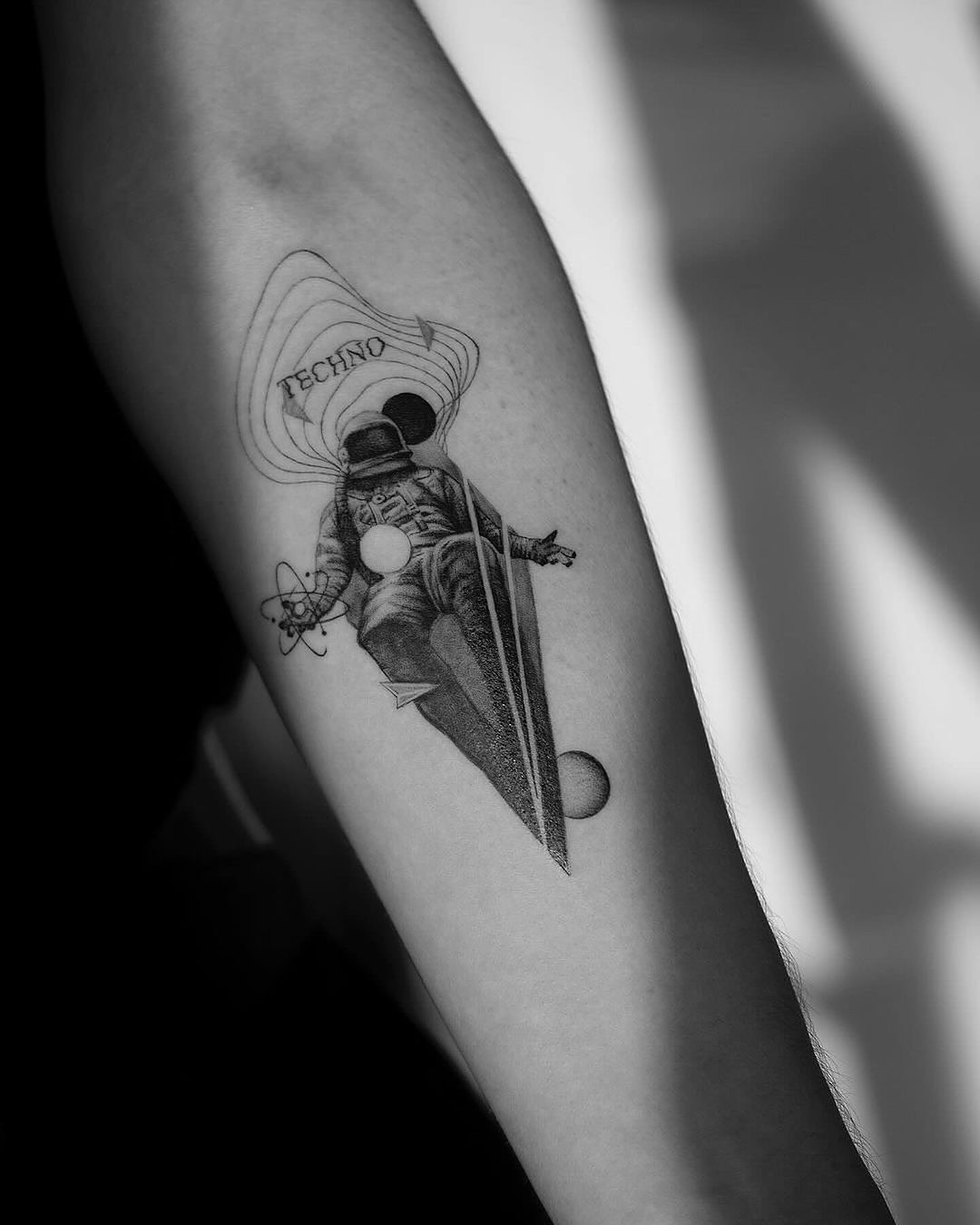 This tattoo features an astronaut floating in a universe of intriguing shapes and symbols. The design captures the essence of exploration and creativity, making it a perfect choice for those who dream of adventure. For anyone considering a tattoo, think about what inspires you whether it’s space, music, or something else entirely.