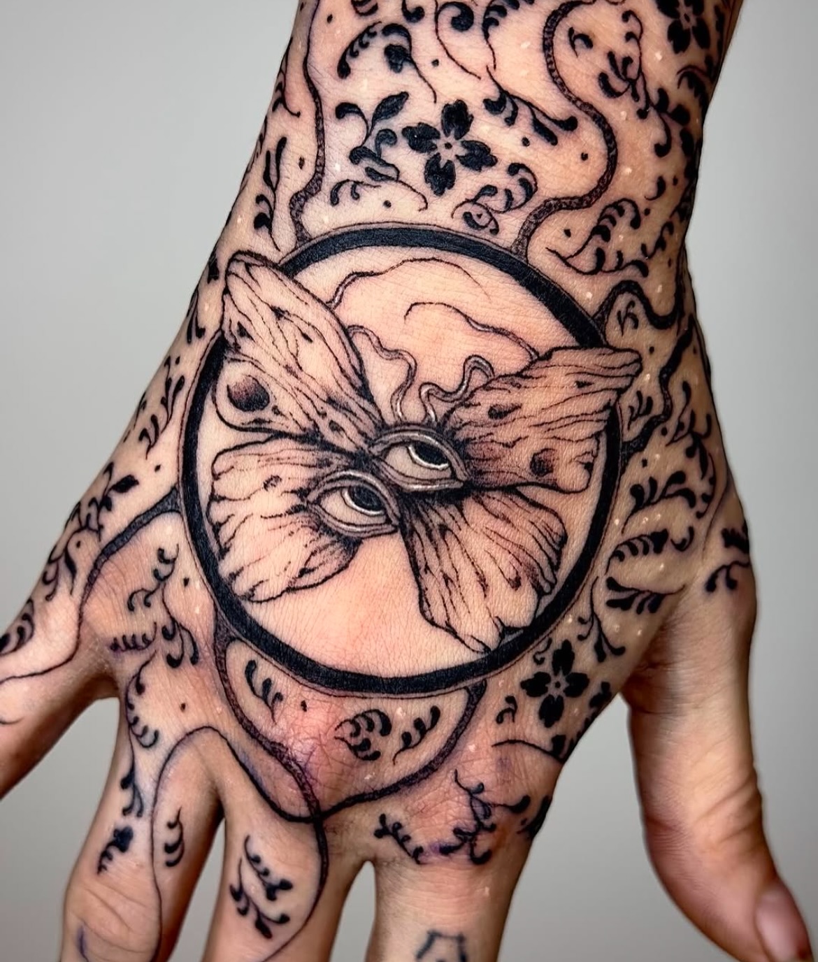 This hand tattoo stands out with its captivating butterfly design, featuring striking eyes that draw attention. The intricate floral patterns surrounding the butterfly add a touch of elegance, making it a true work of art. For anyone considering unique tattoo ideas, this design highlights how personal symbols can transform into stunning pieces of self-expression.
