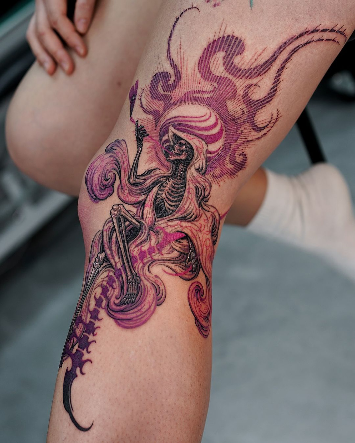 This tattoo features a unique blend of a skeleton and a jellyfish, creating a mesmerizing visual story on the thigh. The intricate details and vibrant colors make it not only a piece of art but also a conversation starter. For those considering a tattoo, exploring creative themes like this can lead to truly personal designs that reflect one’s individuality.