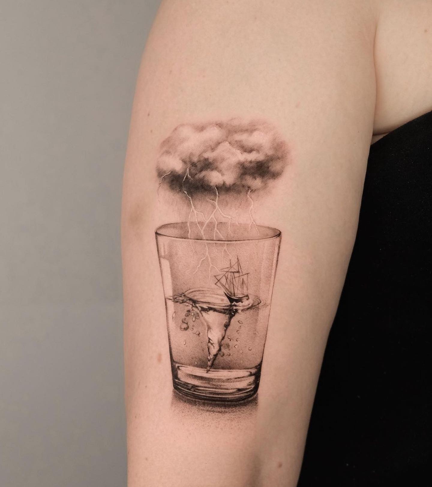 This tattoo captures a stunning scene of a storm brewing inside a glass, complete with swirling water and a tiny ship. The artist’s attention to detail creates an enchanting contrast between the calmness of the glass and the chaos of the storm above. For those seeking unique tattoos ideas, this design beautifully merges everyday objects with imaginative elements, making it a perfect conversation starter.