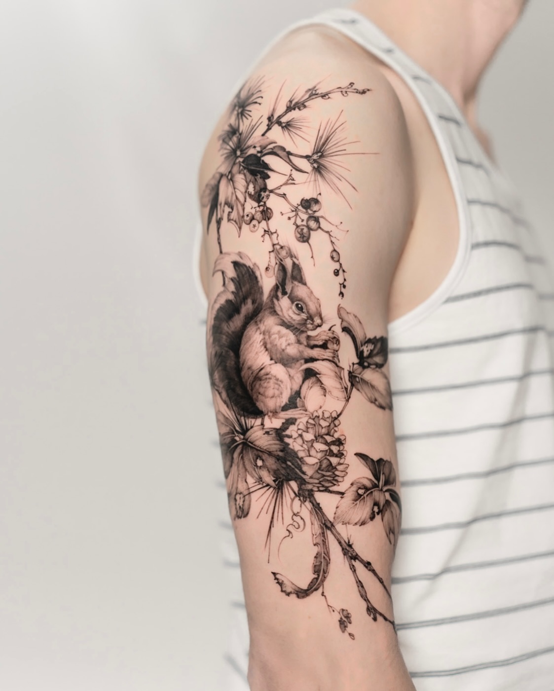 This tattoo beautifully combines a playful squirrel with intricate floral designs, creating a lively scene on the arm. The detailed artwork captures the essence of nature, making it a great conversation starter. For those seeking something truly unique, incorporating animals with natural elements can express personal stories and add depth to a tattoo.
