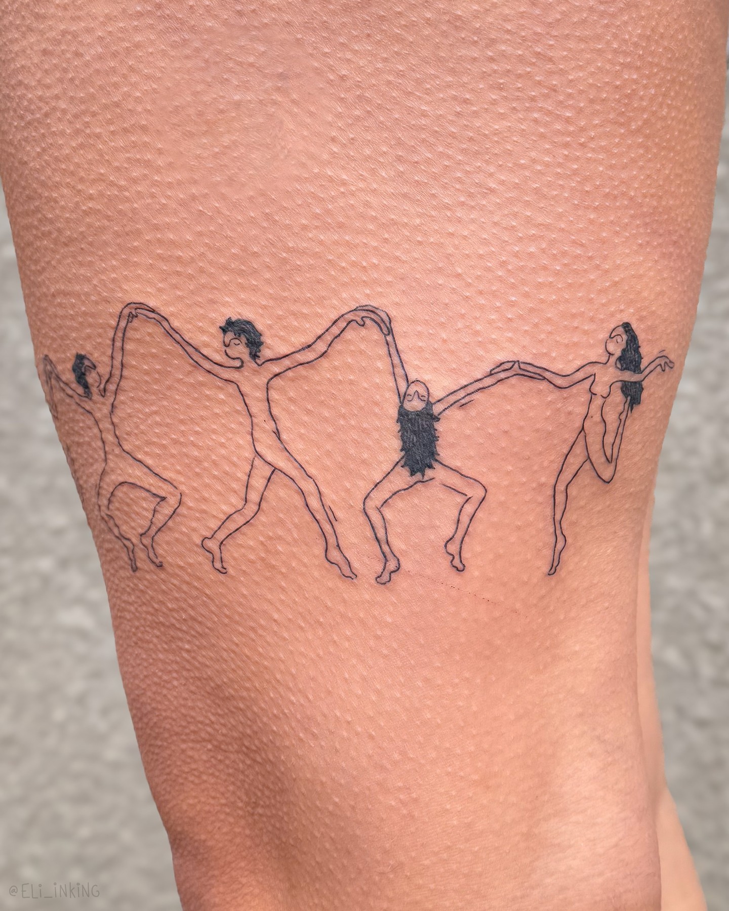 This tattoo features a series of graceful figures holding hands in a lively dance, beautifully celebrating connection and unity. The simple yet expressive lines capture movement and joy, making it a delightful choice for those who cherish relationships. A great tip is to consider a design that reflects personal experiences or bonds, creating a truly unique piece of art.