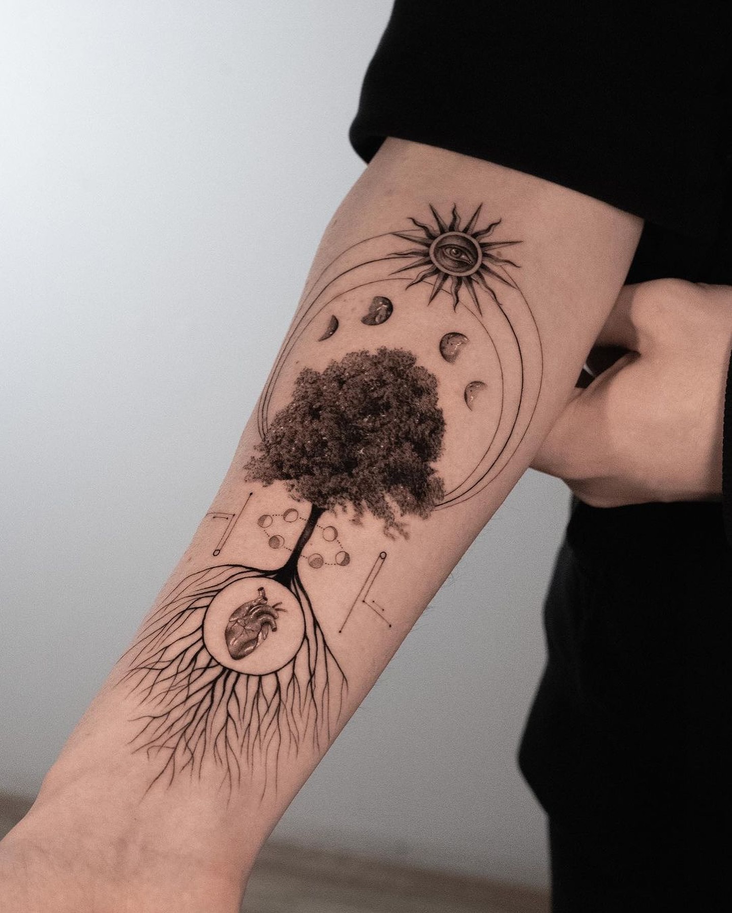 This tattoo stands out with its striking blend of nature and cosmic elements, featuring a tree intertwined with celestial symbols. The design beautifully represents growth and connection, making it a perfect choice for those who appreciate both the earth and the universe. Choosing a tattoo like this can serve as a daily reminder of one s roots and the vastness of possibilities beyond.