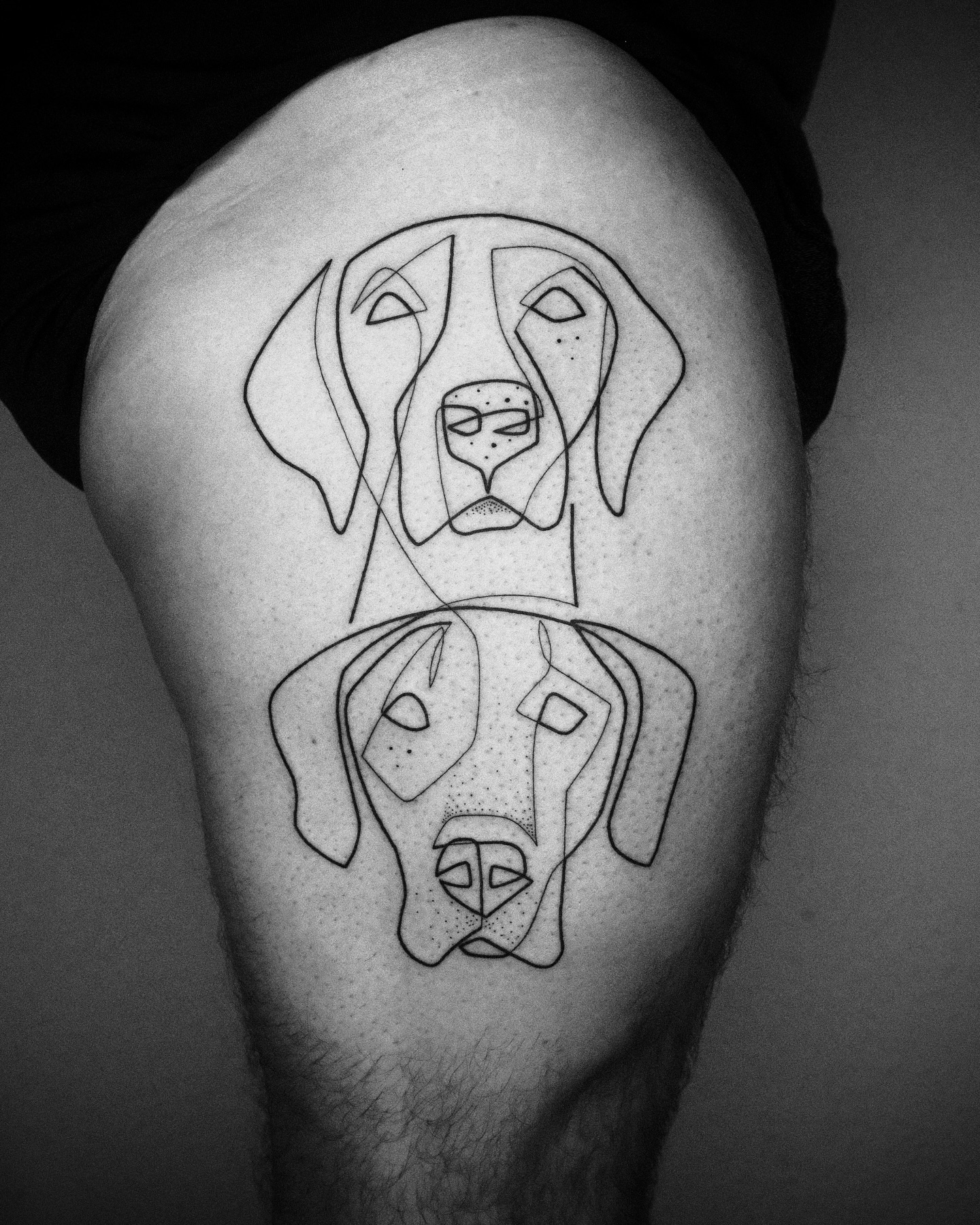 This tattoo features two beautifully designed line art dogs, showcasing a unique blend of simplicity and creativity. The minimalist style captures the essence of these beloved pets while adding a modern twist. For those looking to express their love for animals, this tattoo idea is both striking and personal, making it a fantastic choice for dog lovers.