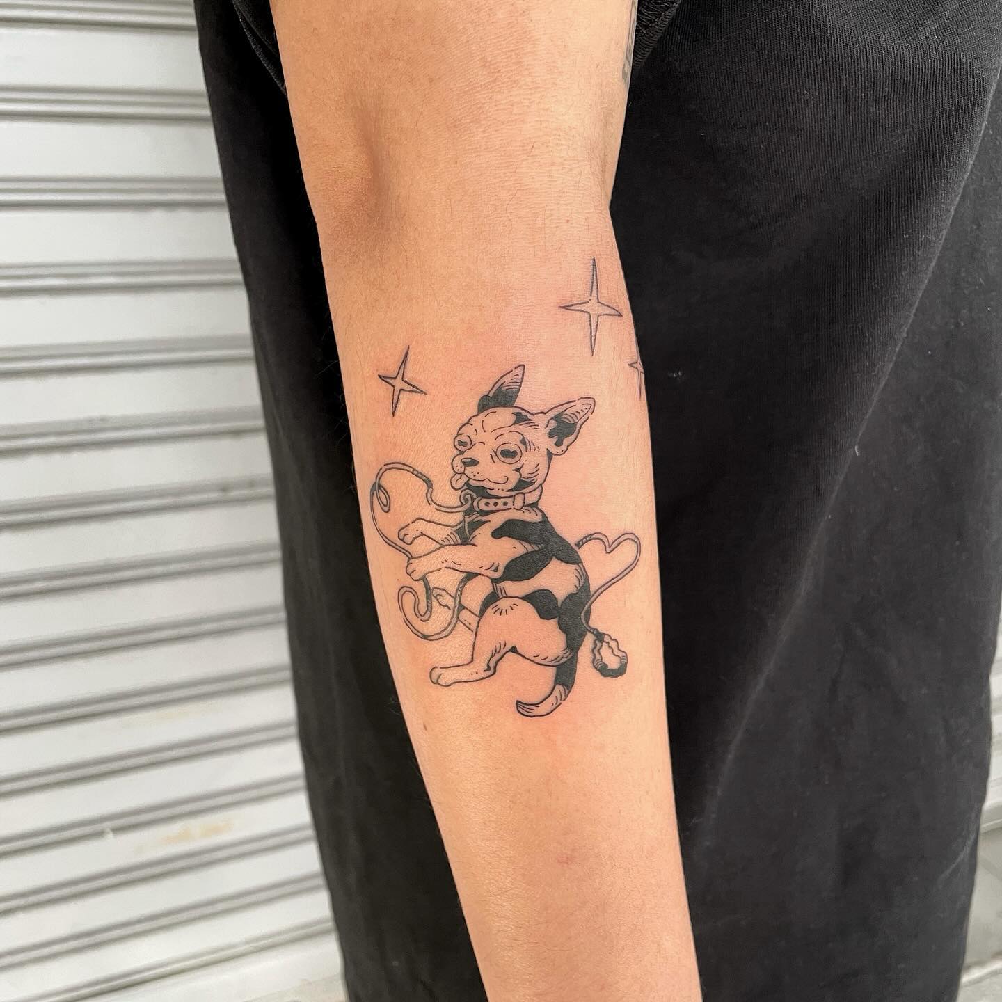 This tattoo features an adorable dog leaping joyfully, capturing the playful spirit of pets. The intricate details and whimsical stars surrounding the pup add a charming touch, making it a delightful piece of art. For those considering a pet-themed tattoo, think about incorporating elements that reflect your pet’s personality for a truly personal design.