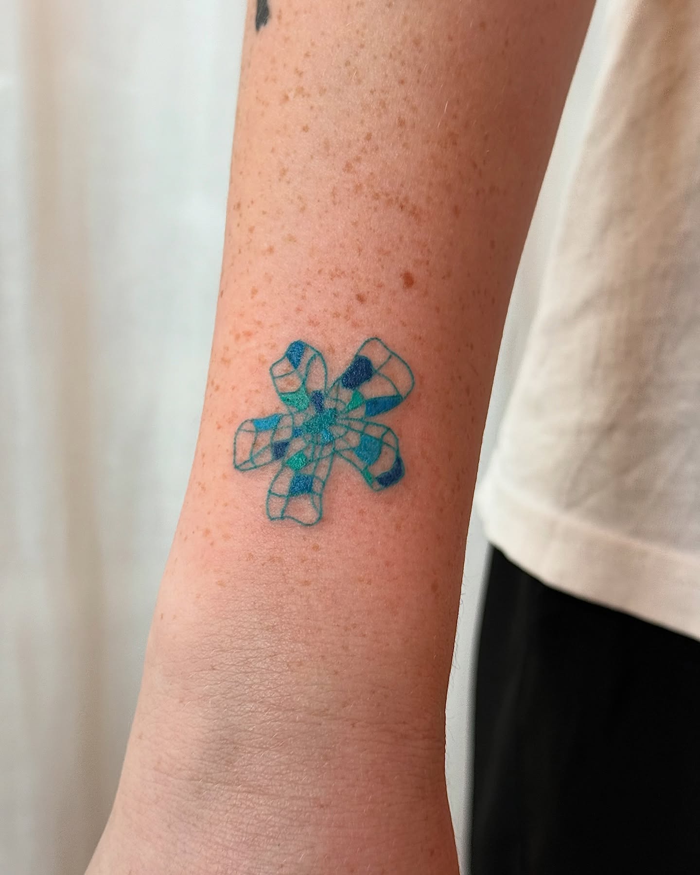 This tattoo stands out with its unique geometric flower design, blending vibrant blues and greens in a captivating way. The intricate patterns create a sense of movement, making it feel alive on the skin. For those considering a tattoo, exploring geometric designs can lead to some truly original ideas that express personal style.