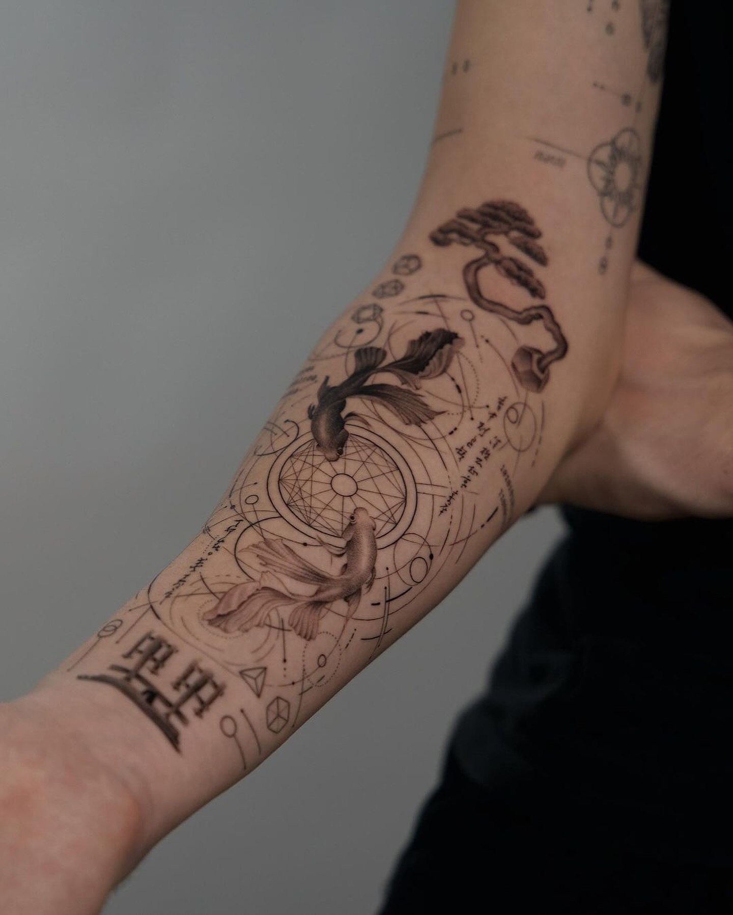 This tattoo design beautifully blends the elegance of koi fish with intricate cosmic patterns. The swirling lines and geometric shapes create a mesmerizing effect, making the arm a canvas of art and symbolism. For those seeking unique tattoos ideas, consider incorporating personal meanings or elements that reflect your journey, just like this stunning piece.