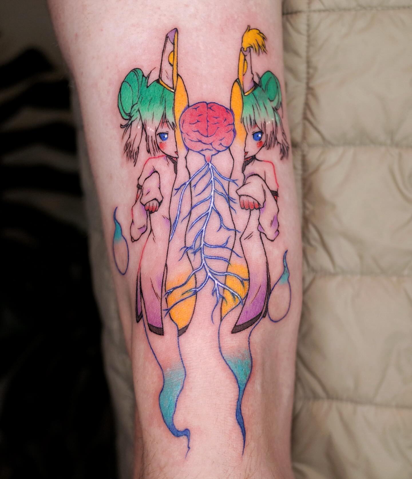 This tattoo stands out with its vibrant colors and imaginative design, featuring two charming characters intertwined with anatomical elements. The playful mix of fantasy and reality creates a striking visual story that invites curiosity. For those considering unique tattoo ideas, think about blending different themes to express your personal journey or interests.