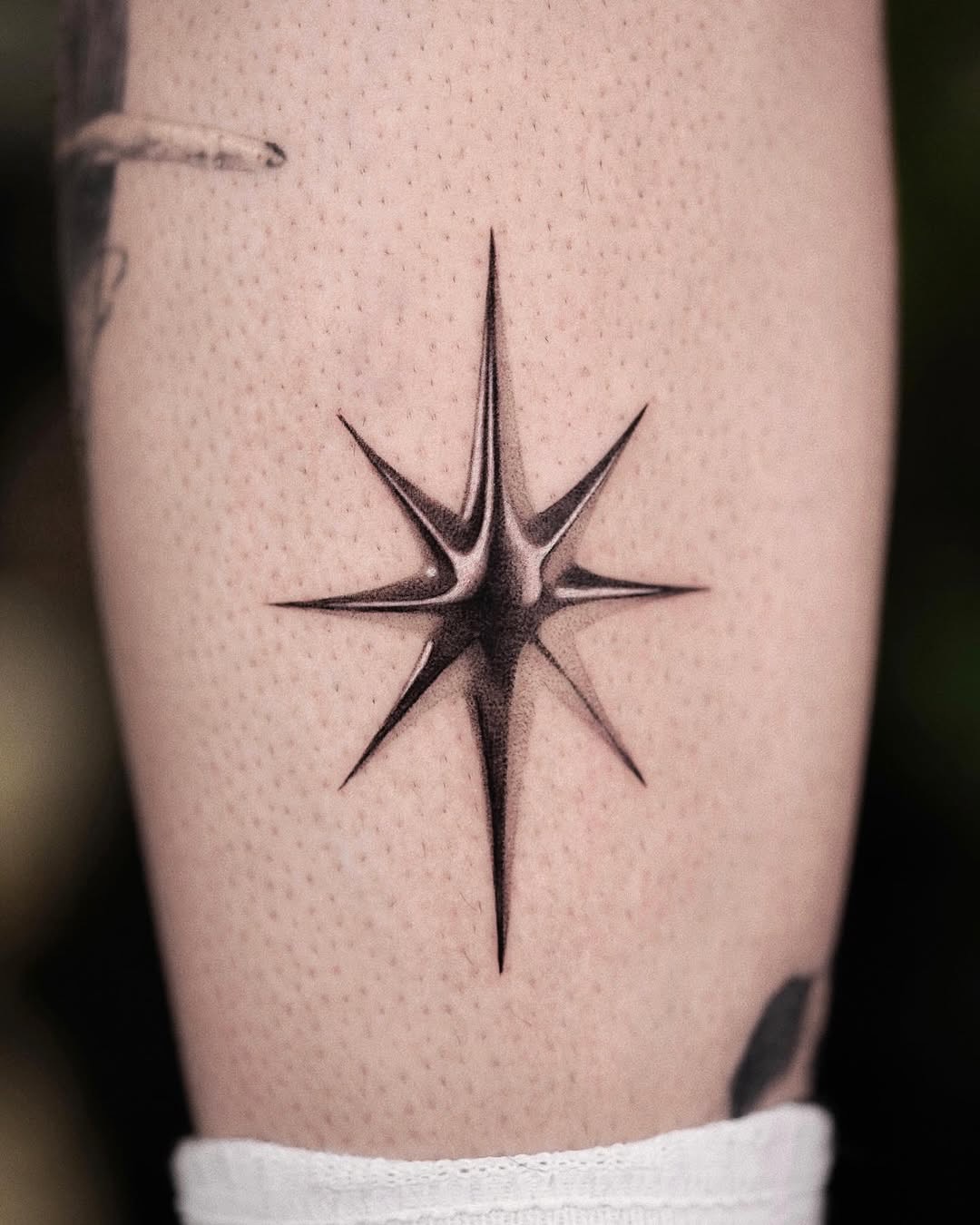 This tattoo stands out with its striking starburst design, creating a sense of movement and energy. The bold lines and shading give it a three-dimensional look, making it appear almost like it s popping off the skin. For anyone seeking unique tattoos ideas, a starburst can symbolize guidance and direction, making it a meaningful choice as well.