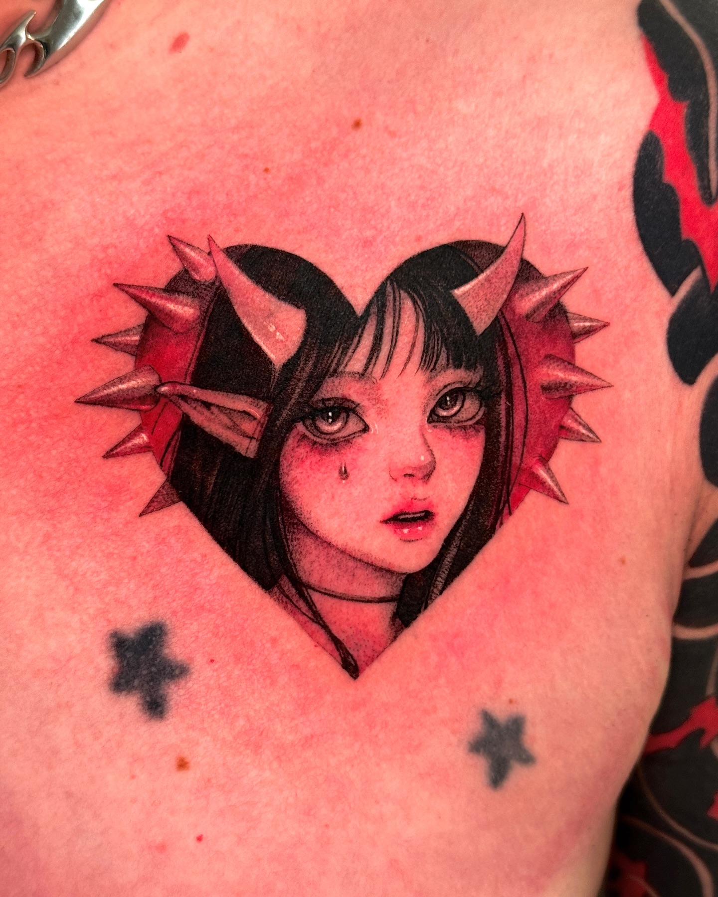 This tattoo features a striking design of a girl s face framed by a heart, complete with sharp horns and a touch of red that adds a dramatic flair. The combination of beauty and edge makes this piece stand out, telling a story of both vulnerability and strength. For those looking for unique tattoos ideas, consider how personal symbols can blend contrasting elements to create something truly memorable.