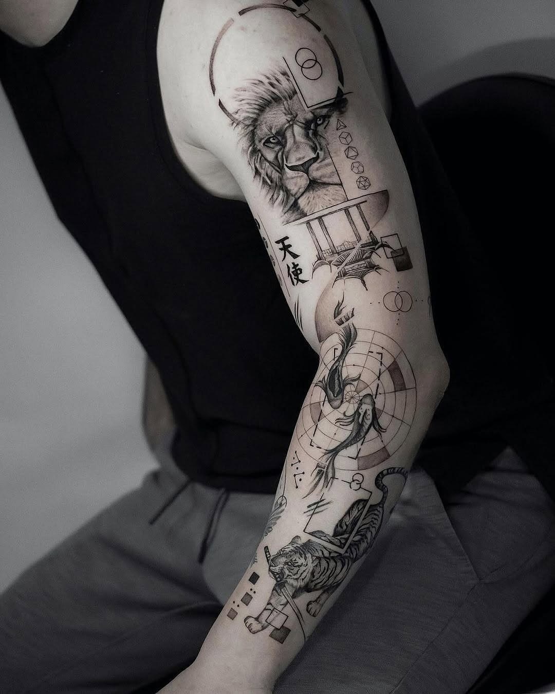 This tattoo features an impressive mix of a lion and a tiger, showcasing intricate details and a striking design. The combination of powerful animals, along with abstract shapes and symbols, tells a story of strength and courage. For those seeking unique tattoos ideas, blending different elements like this can create a personal masterpiece that reflects individual identity.