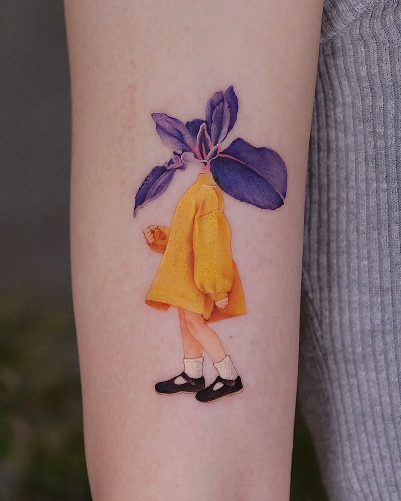 This tattoo features a whimsical design of a headless girl wearing a bright yellow dress, with vibrant purple leaves sprouting from her neck. It beautifully combines the innocence of childhood with elements of nature, creating a striking visual that tells a story. For those seeking unique tattoos ideas, consider how personal symbols can be blended with imaginative elements for a truly distinctive piece.
