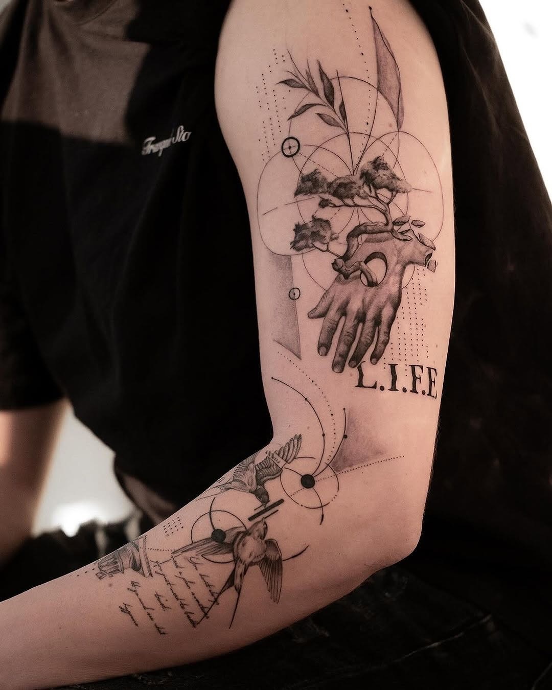 This tattoo combines elements of nature and humanity in a stunning way, featuring a hand intertwined with trees and delicate birds. The intricate details and thoughtful design create a striking visual that tells a story about life and connection. For those seeking unique tattoo ideas, exploring themes that blend personal meaning with natural elements can lead to truly remarkable designs.