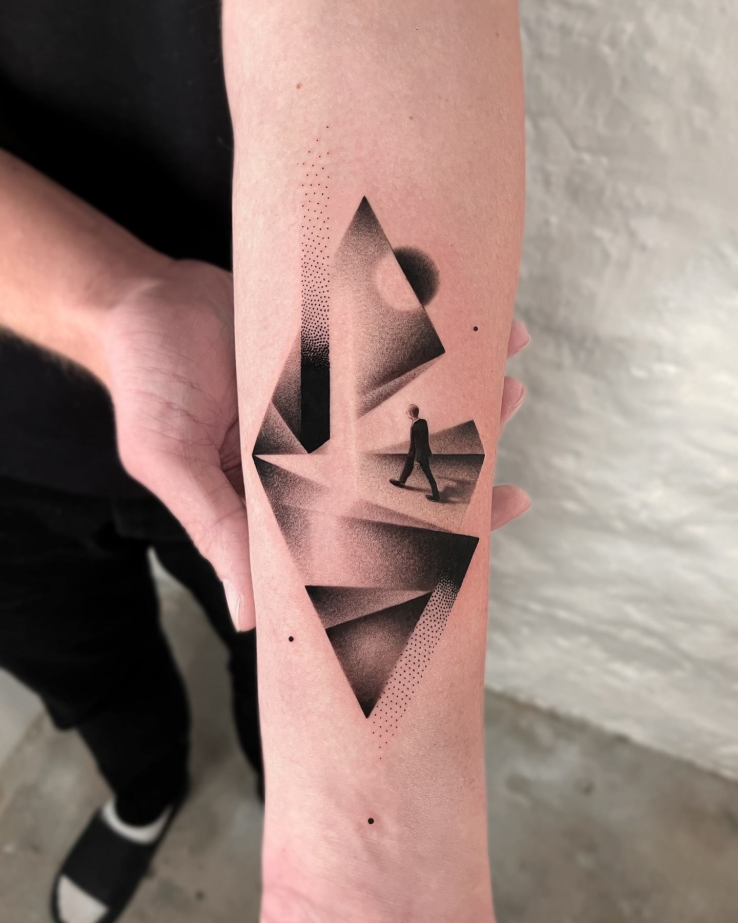 This tattoo features a striking design of geometric shapes that create the illusion of a walking figure exploring an abstract landscape. The blend of sharp angles and soft shading draws the eye, making it an enchanting piece of body art. For those seeking unique tattoos ideas, consider designs that tell a story or evoke a feeling.